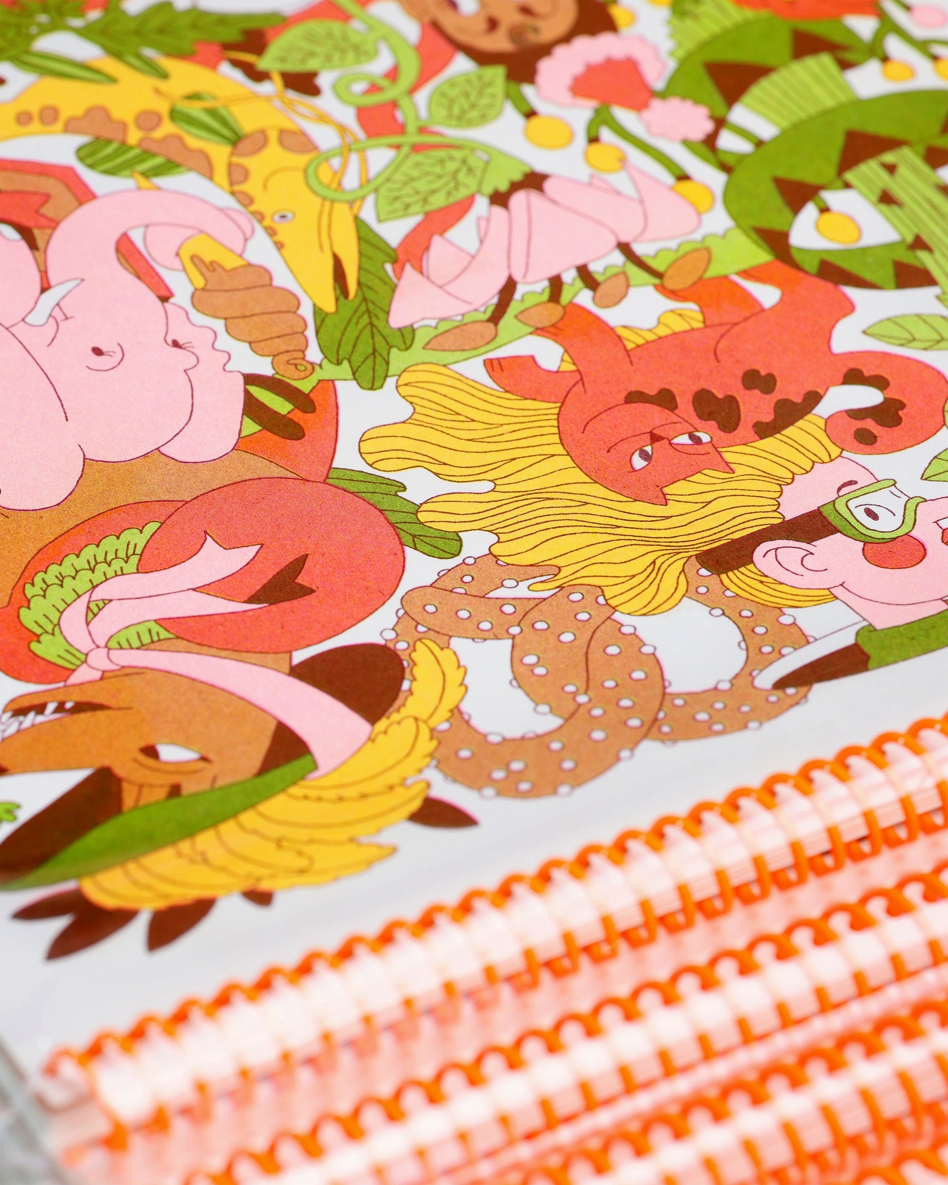 This calendar is a collection of changeable, hangable Risograph-printed illustration pieces (with the months and days thrown in there of course). Risograph printed by the artist during her residency at Directangle Press in New Hampshire. Each spread uses a completely different set of inks, making for a fun new vibe every month.