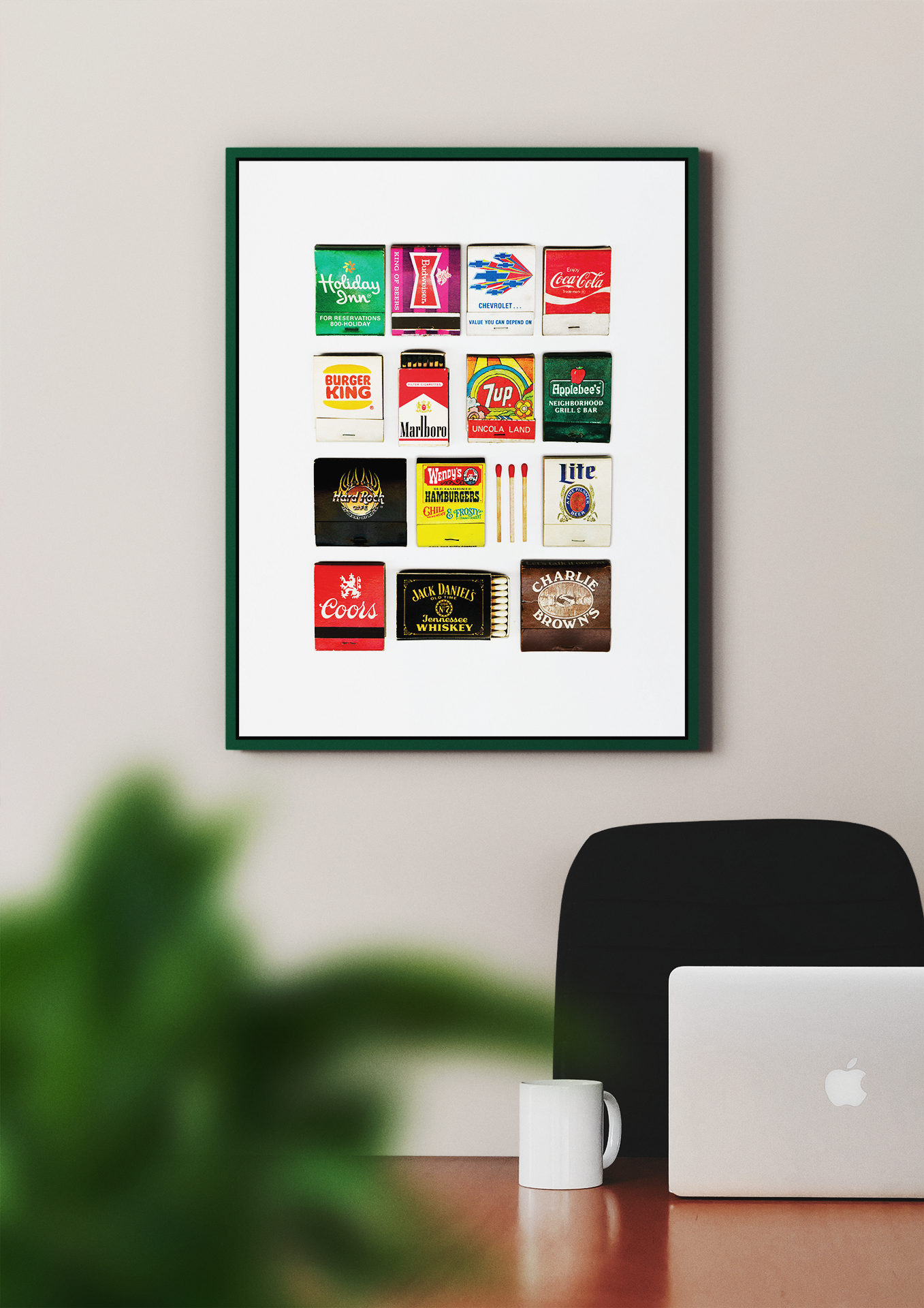 This print features high-quality images of real vintage matches combining art, design, history, and nostalgia to create the perfect wall decor. This piece highlights many famous chains and brands like Coca-Cola, Burger King, Applebees, and more.