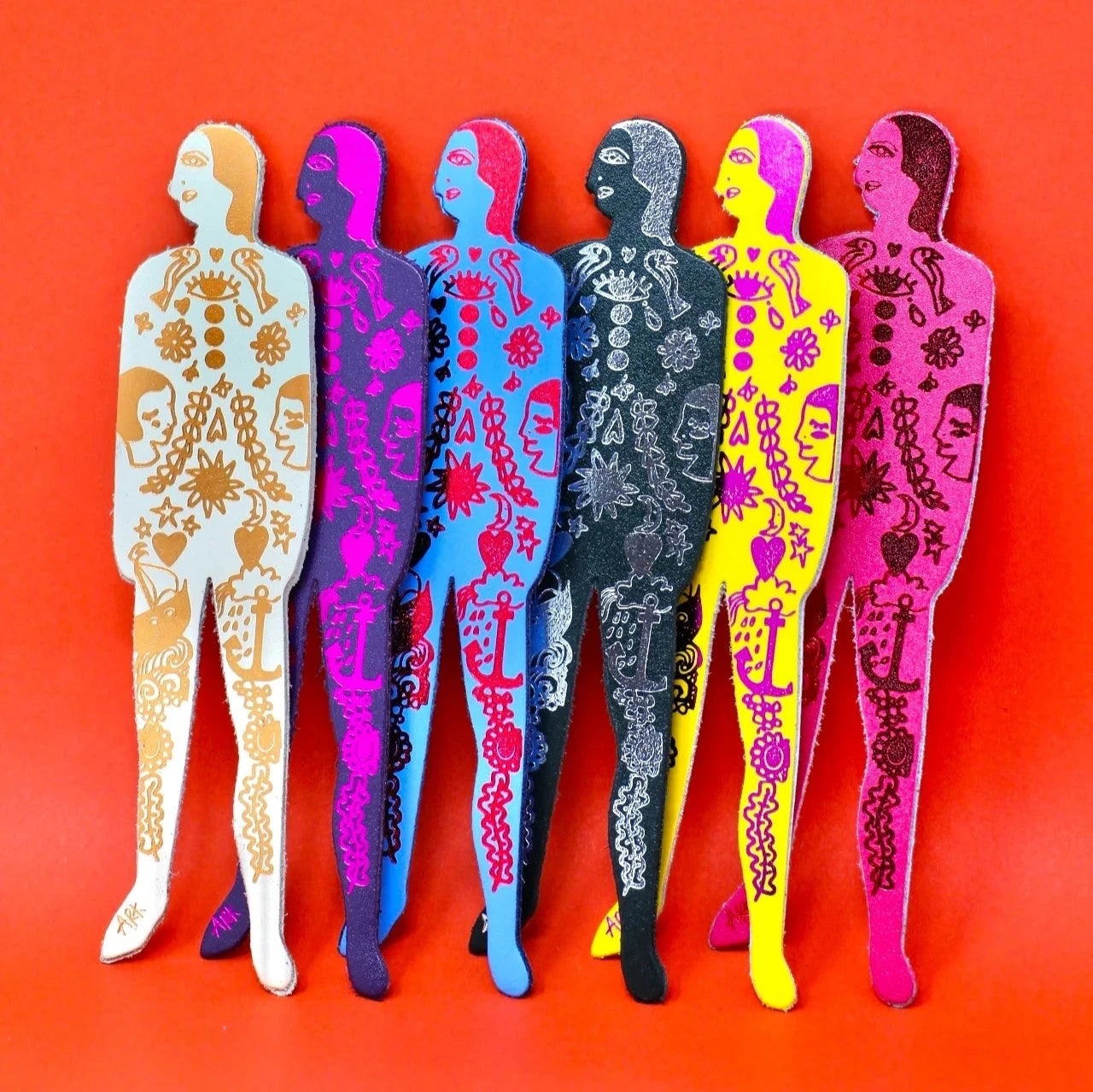 One side is tattooed, the opposite side is nude. A foil-embossed, genuine leather bookmark. Made in Scotland. Approx. 7.8" in height. Available in assorted colors. (Color chosen at random for online orders.)