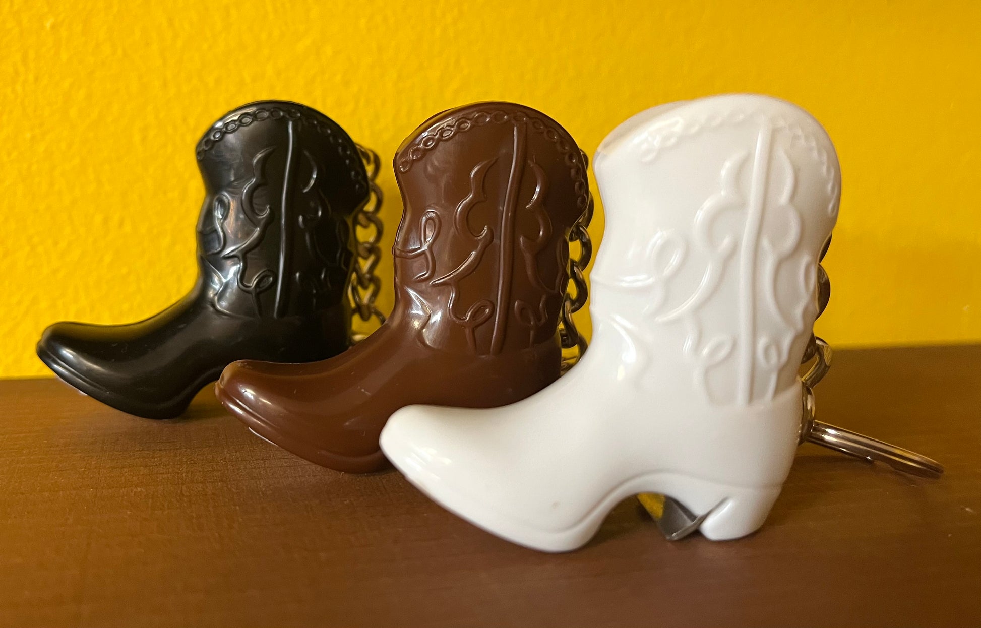 Features a hollow plastic 2" cowboy boot with a bottle opener on the bottom, all hanging from a silver chain and keyring.