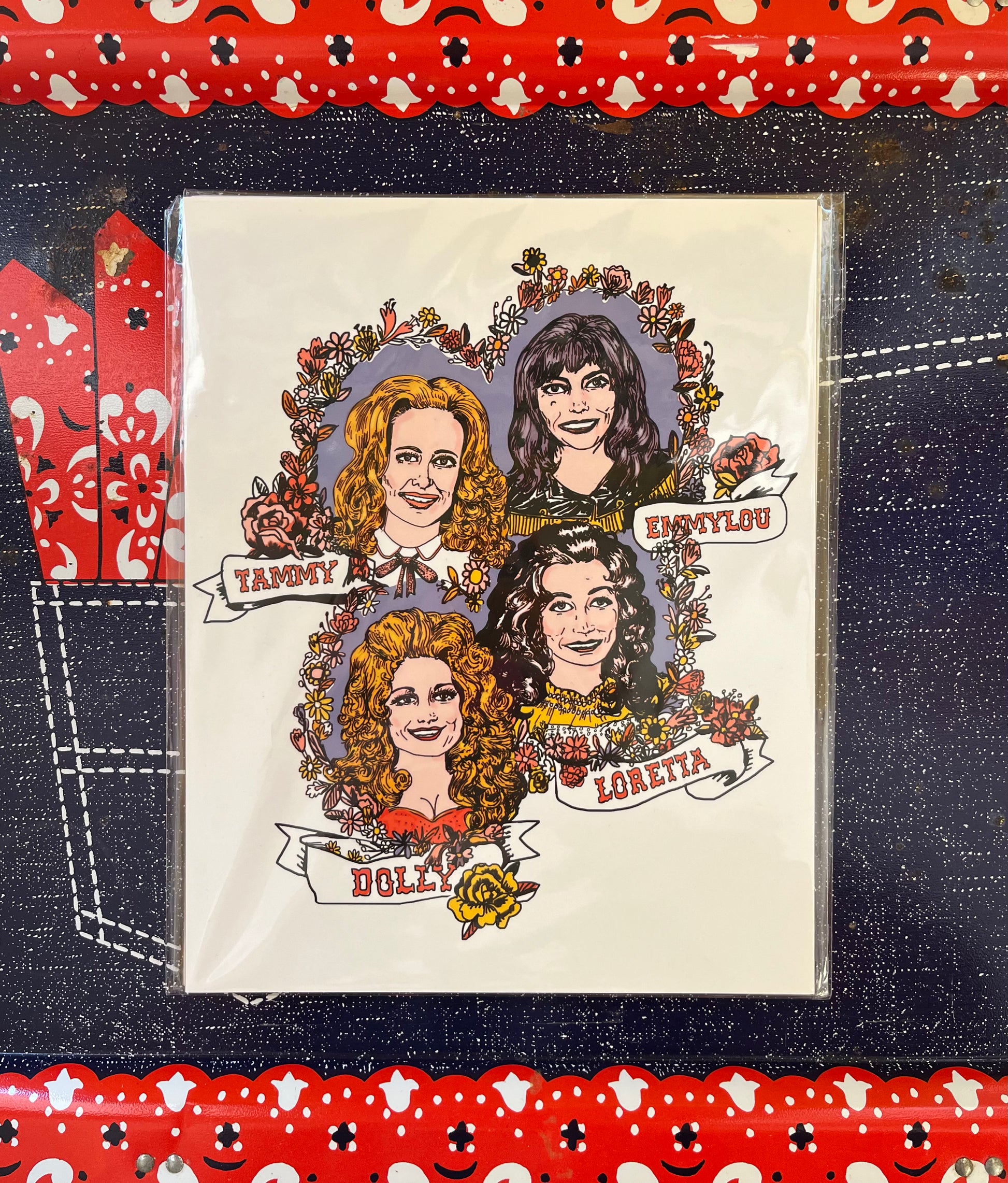 Giclée print of your best friends: Emmylou Harris, Tammy Wynette, Loretta Lynn and Dolly. Measures 8x10".