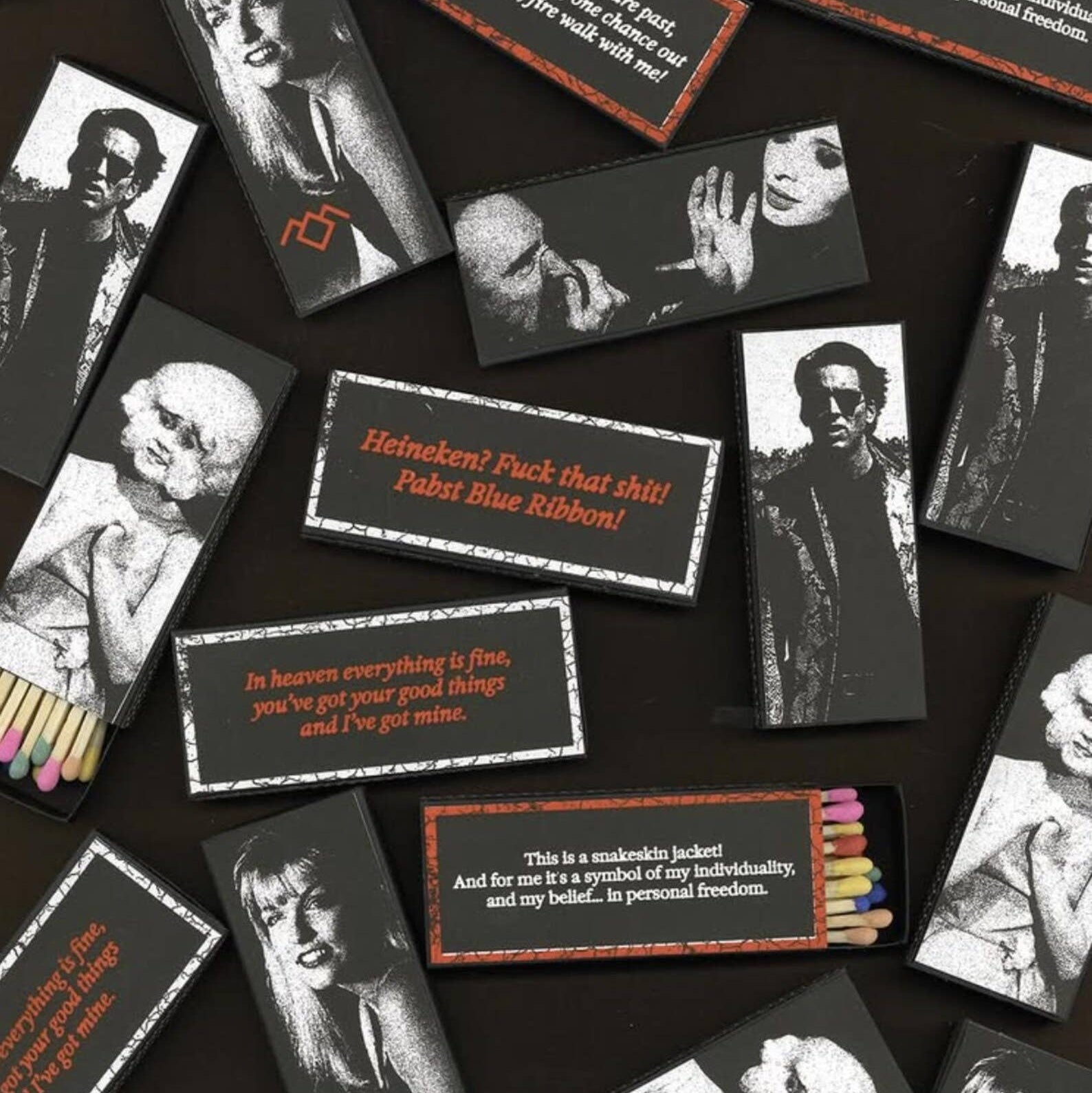 A box of matches featuring David Lynch's Laura Palmer from Twin Peaks with a movie quote on the backside. The box contains approx. a dozen 3" matches and features risograph-printed artwork on the front and back cover. Match head colors may vary. Measures 3.4x1.4".