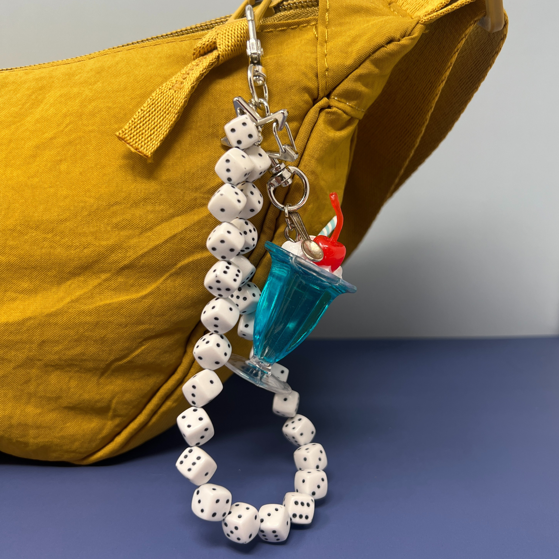 Flash some Y2K vibes with this dice bead phone charm bracelet, complete with a blue milkshake keychain charm. Made with mini white dice beads strung on a stretch cord and an acrylic charm, this lightweight bracelet loops easily on most phone cases or bags. Measures approx. 6.5-7" long.