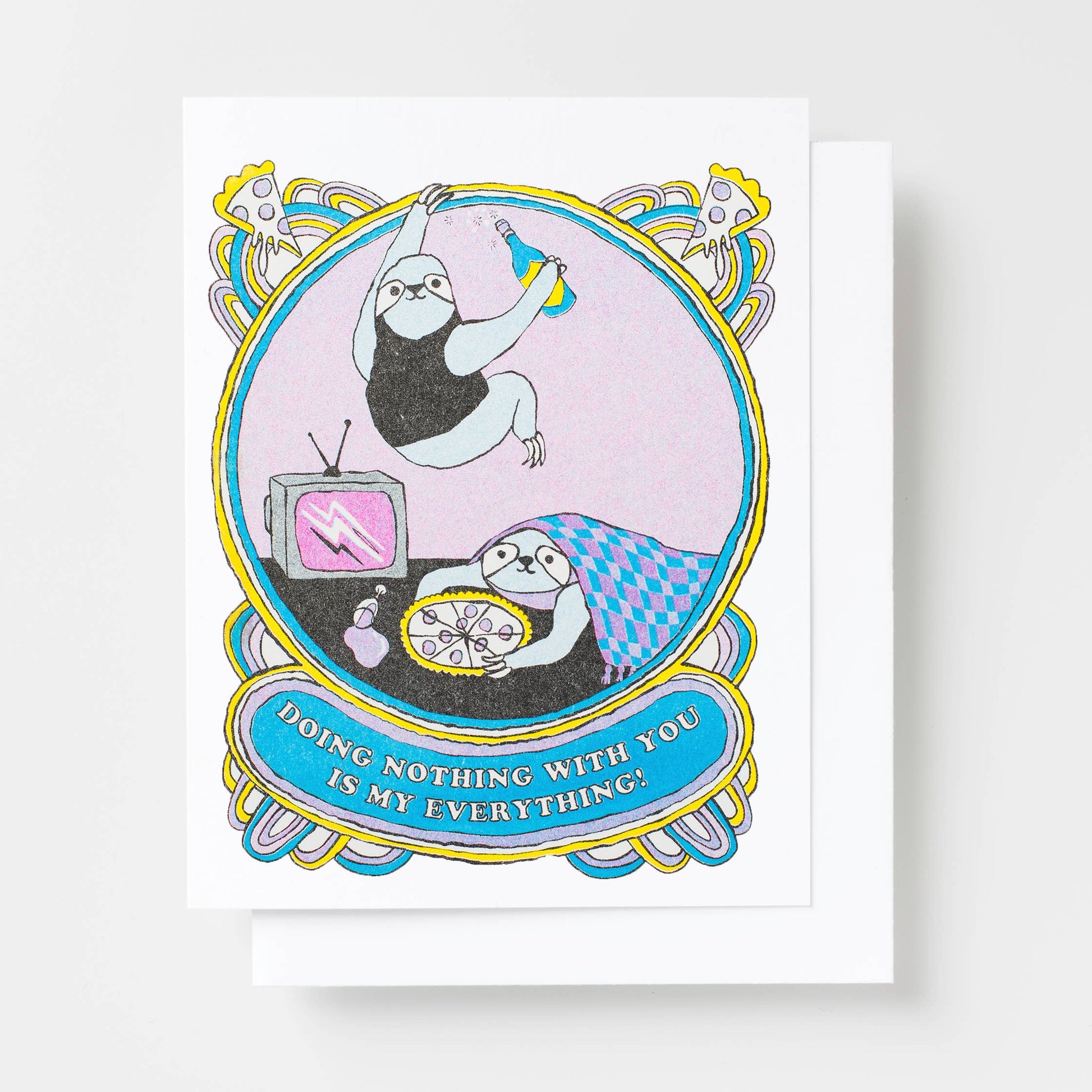 Risograph printed with veggie-based inks on 100% recycled paper. Blank inside/envelope included. Measures 4.25x5.5".