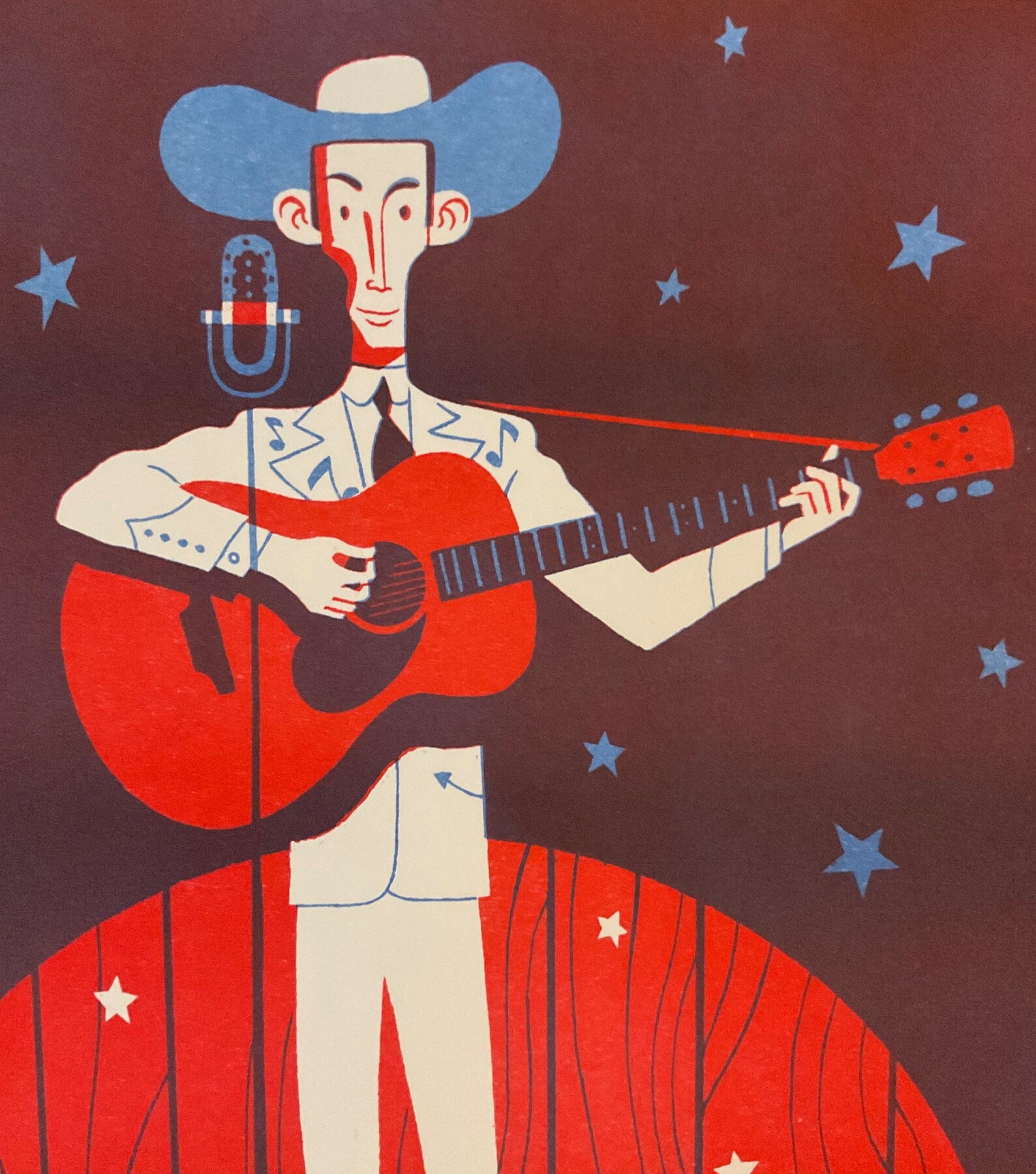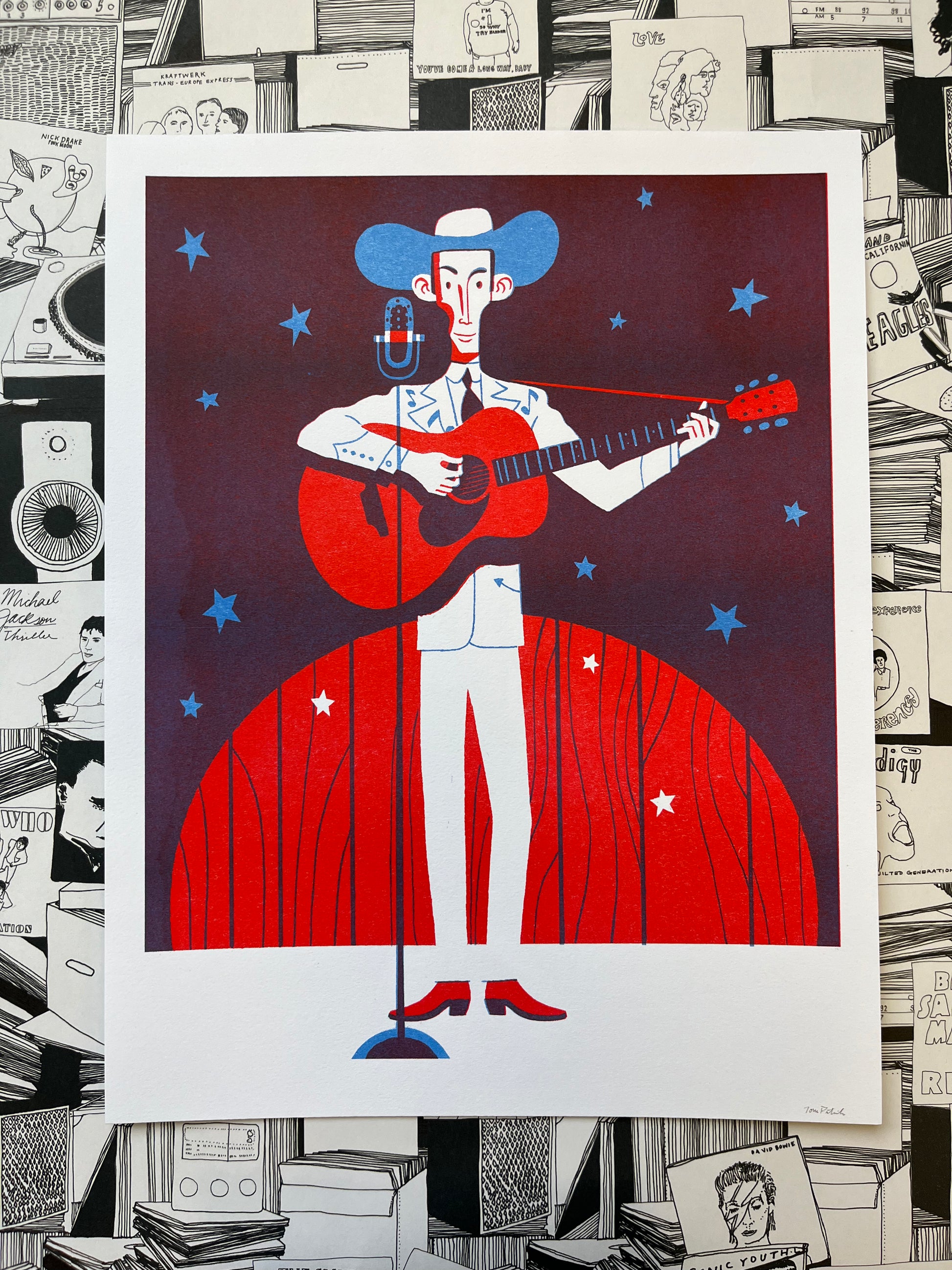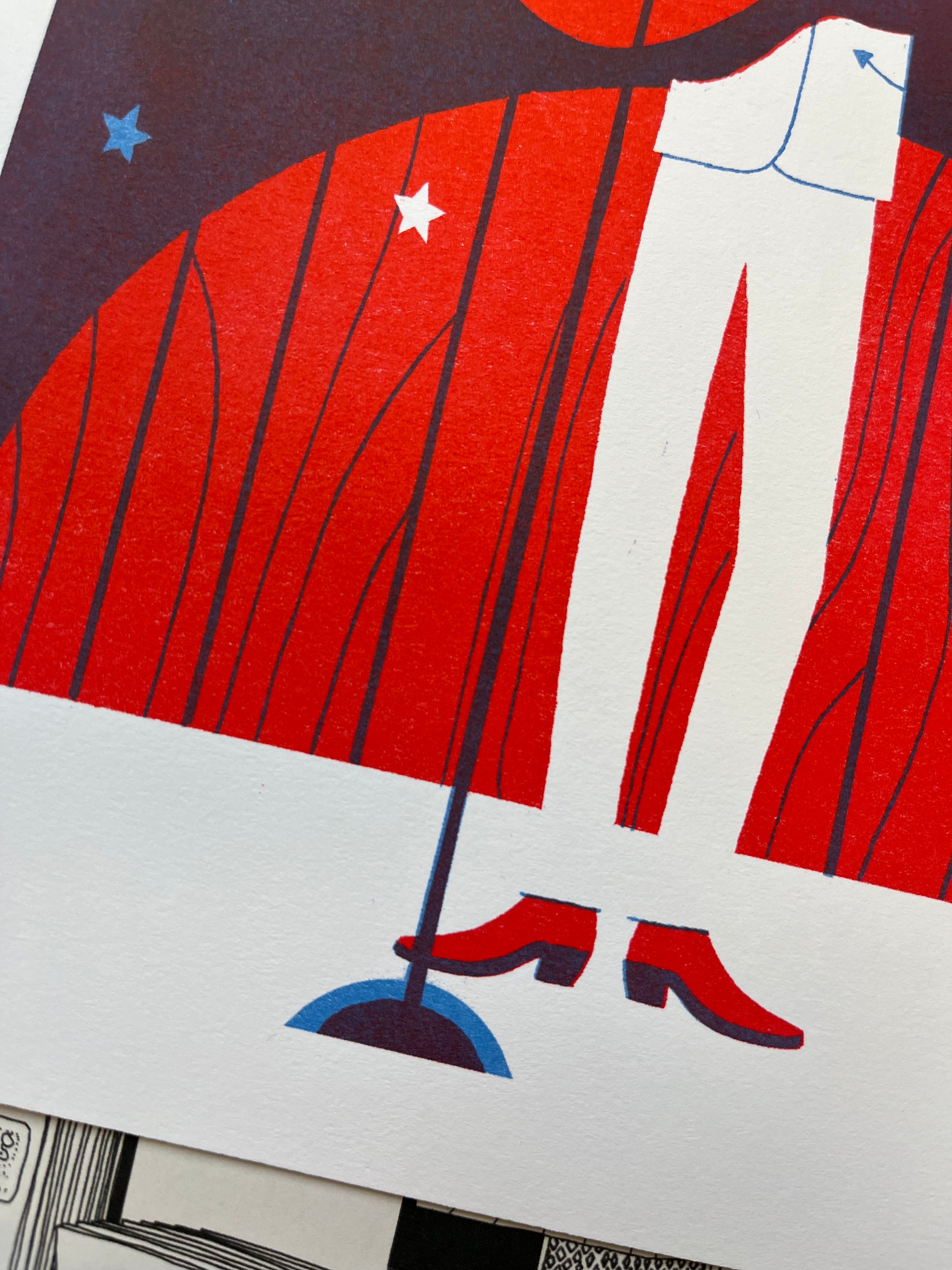 This blue and red risograph print is an original illustration by Tom Patrick. Please note that risograph prints may have subtle differences due to the handmade process. Measures 8.5x11".