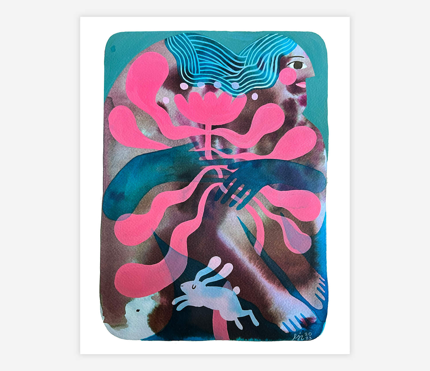 This series explores the relationship between water, plants and human beings using joyful colors — it embraces both loose ink puddles and tight lines mixed with looping, stylized plant drawings.