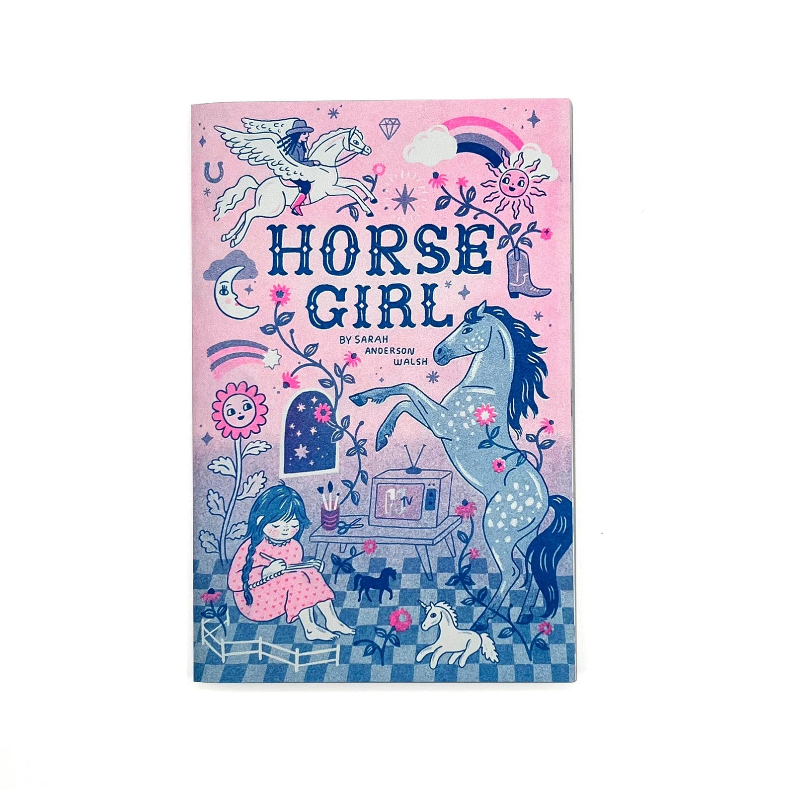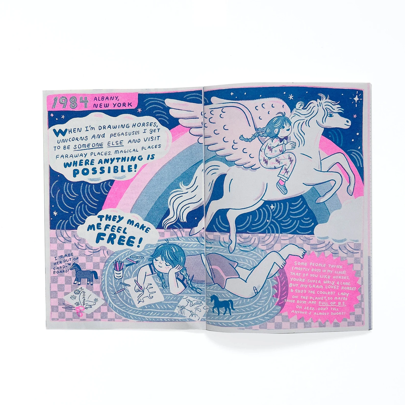 Self published (written, illustrated and designed) by Sarah Anderson Walsh, Horse Girl bursts with horse-centered childhood memories, fun fashion, and 80’s nostalgia, all printed with fluorescent pink and blue risograph ink. This zine is about redefining the term “horse girl” and about holding on to the things you loved when you are a kid, because they preserve the most playful and imaginative parts of you.