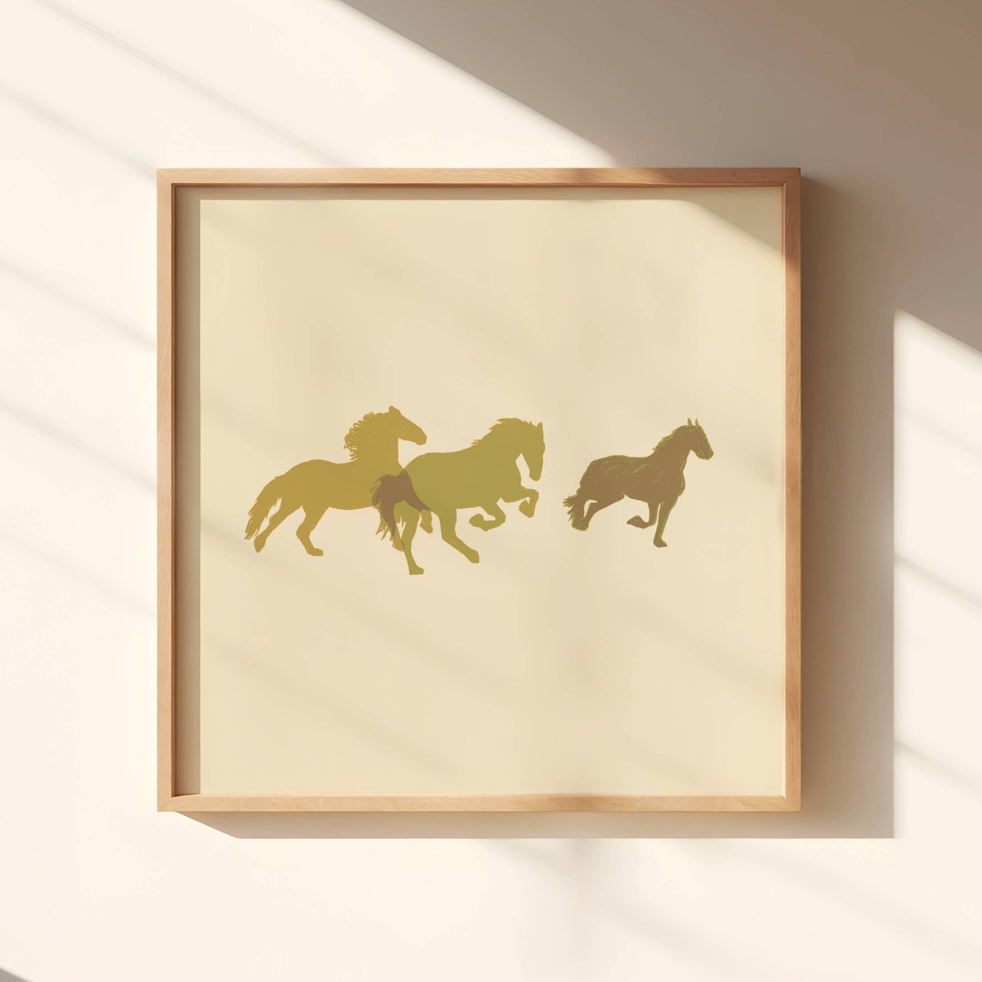 Galloping horses, hand-drawn and digitally printed on premium heavyweight matte paper. Measures 8x8". Frame not included.