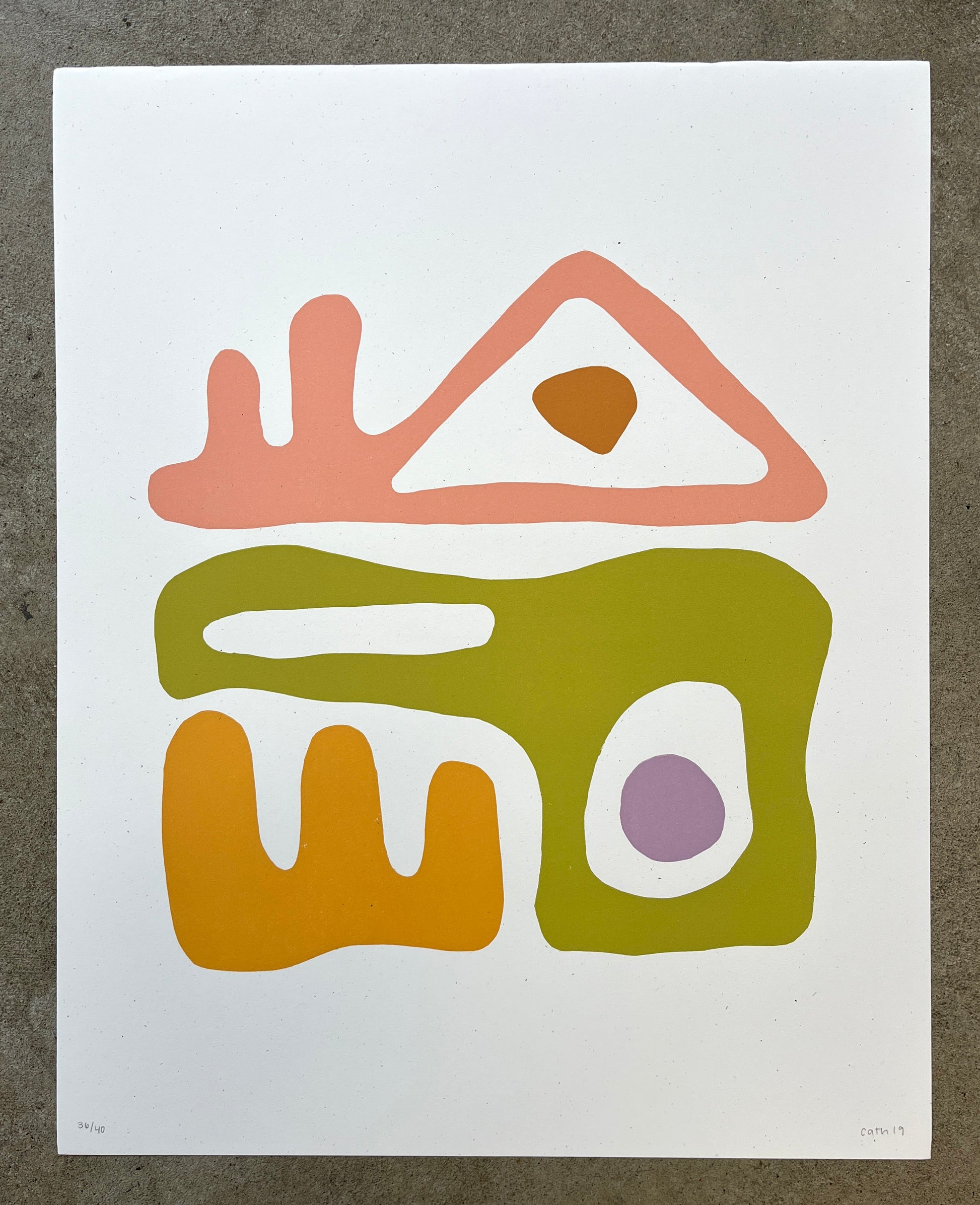 Five color letterpress print on Speckletone French paper by local artist Cathy Batliner. Available in Bungalow, Townhouse and Tall & Skinny. Measures 16x20". Frame not included.