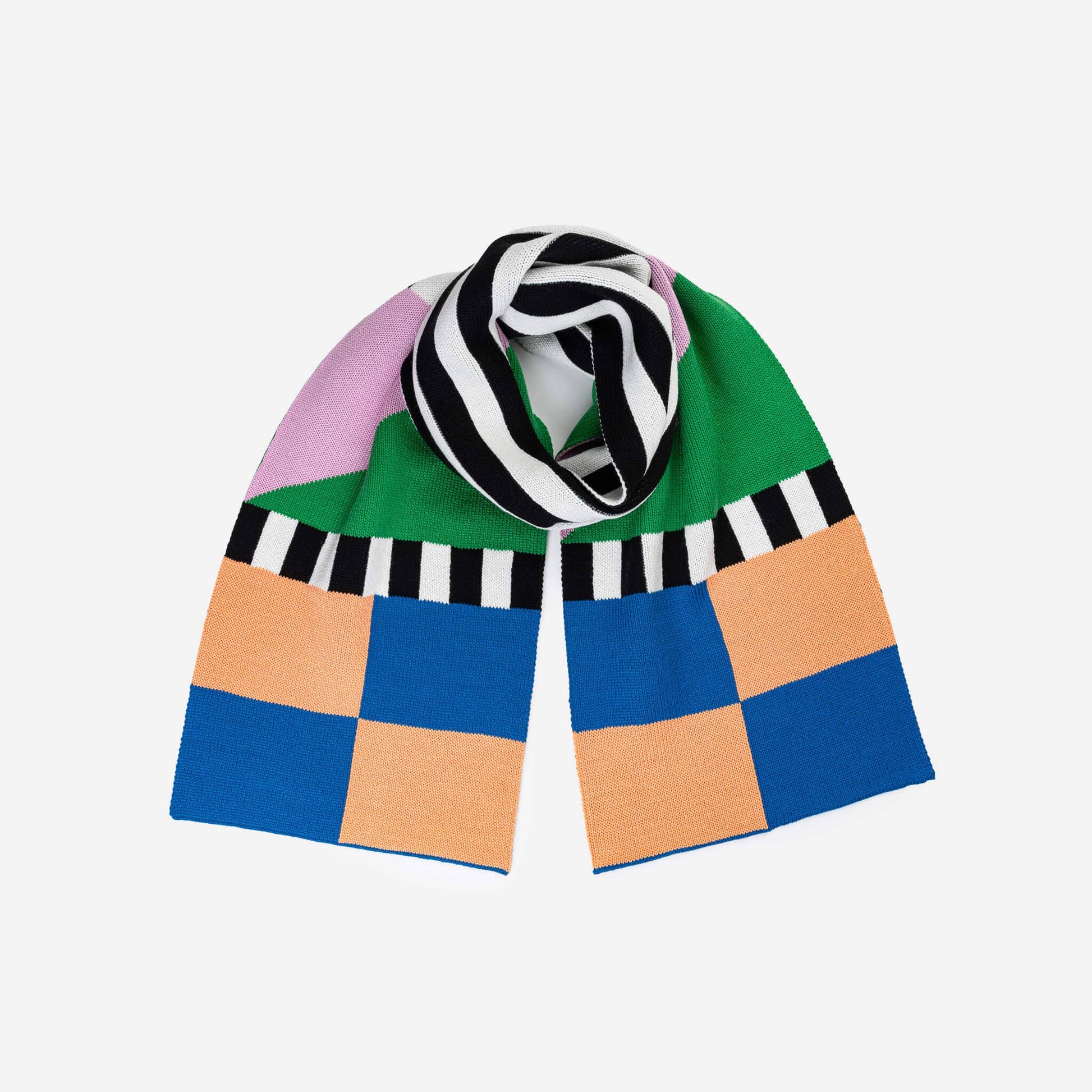 Oversized, soft jacquard knit scarf with varied horizontal stripes. Layer on the color with this big, comfy, cozy scarf all fall and winter long. Can be worn long or wrapped up like a cowl for extra warmth. Fully reversible. Made with new and repurposed deadstock yarn.