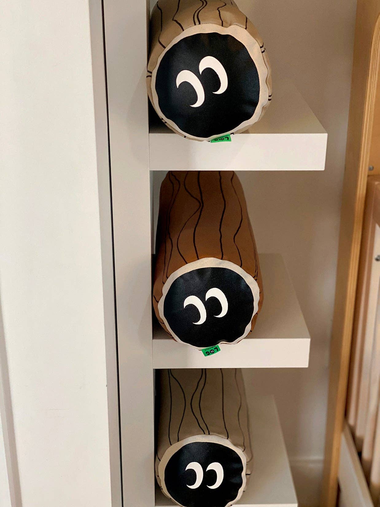 This cozy log pillow comes in light or dark brown bark and features critter eyes screenprinted on both ends, keepin' an eye out for you while you relax!