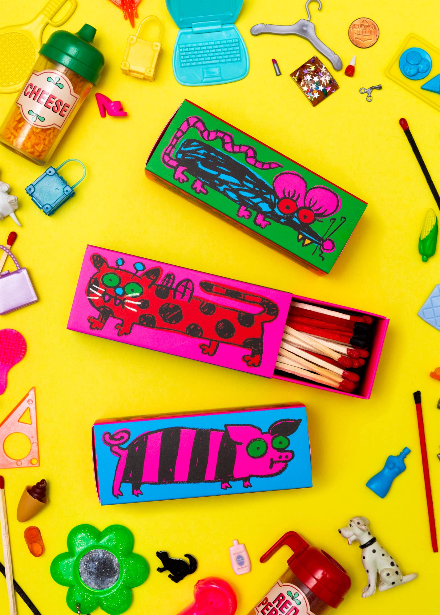 A mix of red and black matches stocked in a vivid drawer box with striker strip. Box measures approx. 4x1.5x1.5". Please use responsibly!