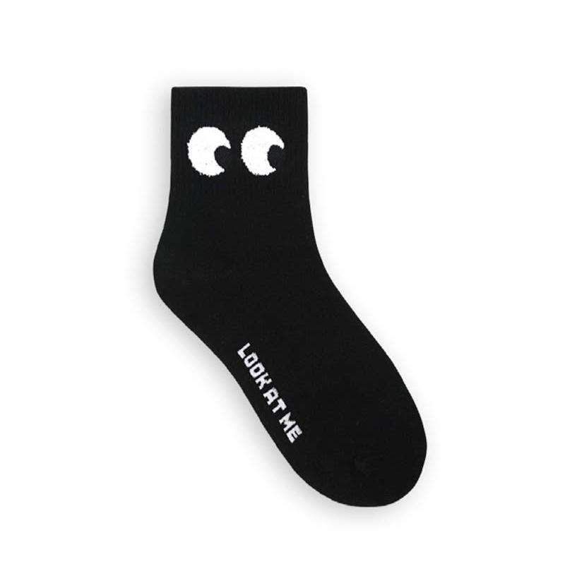 Hey! My eyes are down here?? This pair of socks fits US size 5-10. Made of combed cotton and spandex. Available in black and yellow.