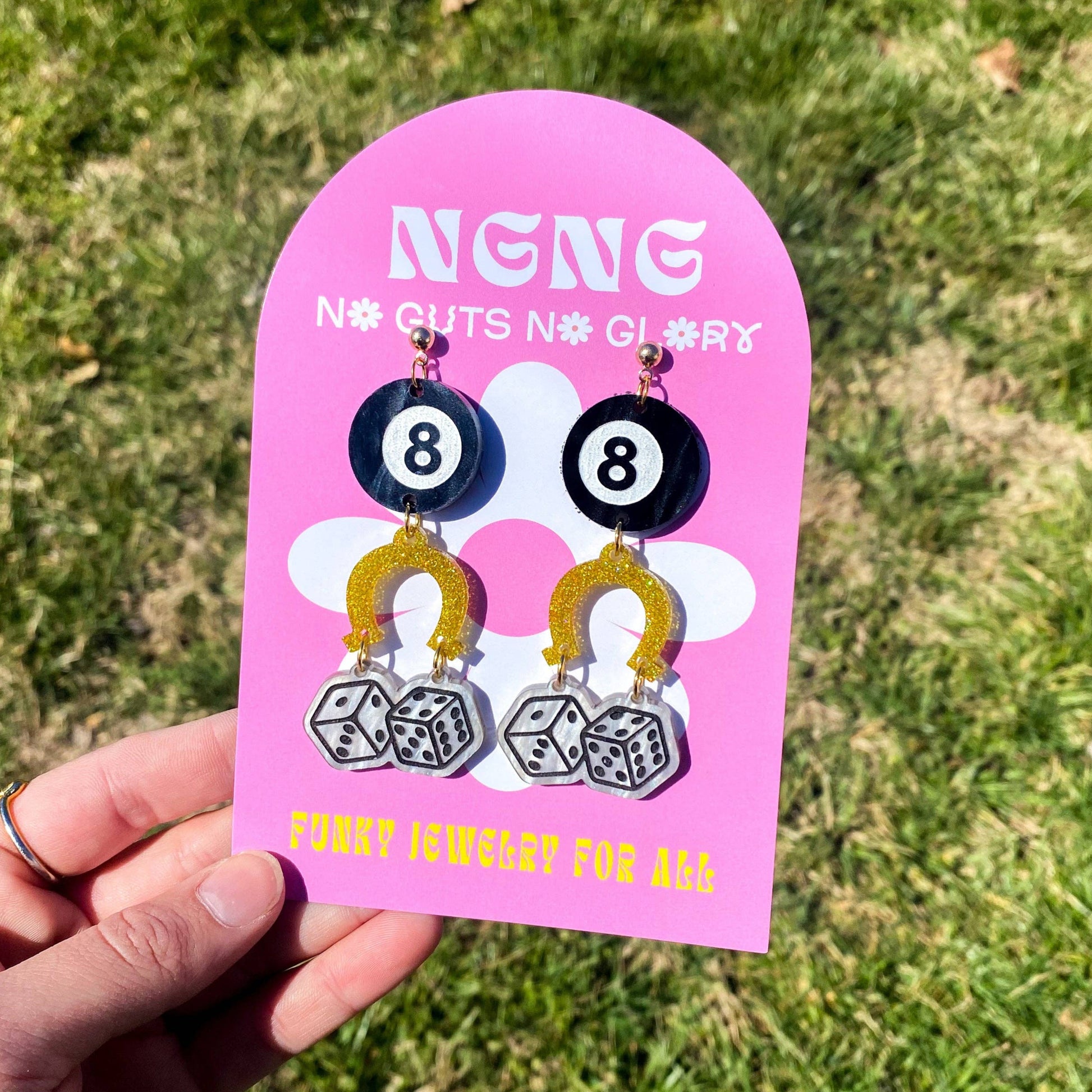 Made with acrylic, acrylic paint and accompanied by nickel-free hypoallergenic gold plated ball studs. Each earring measures 2.6" long.