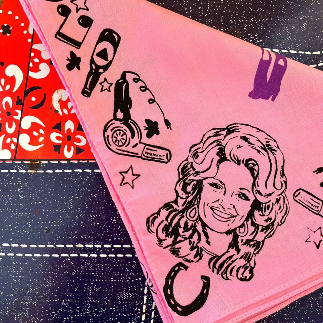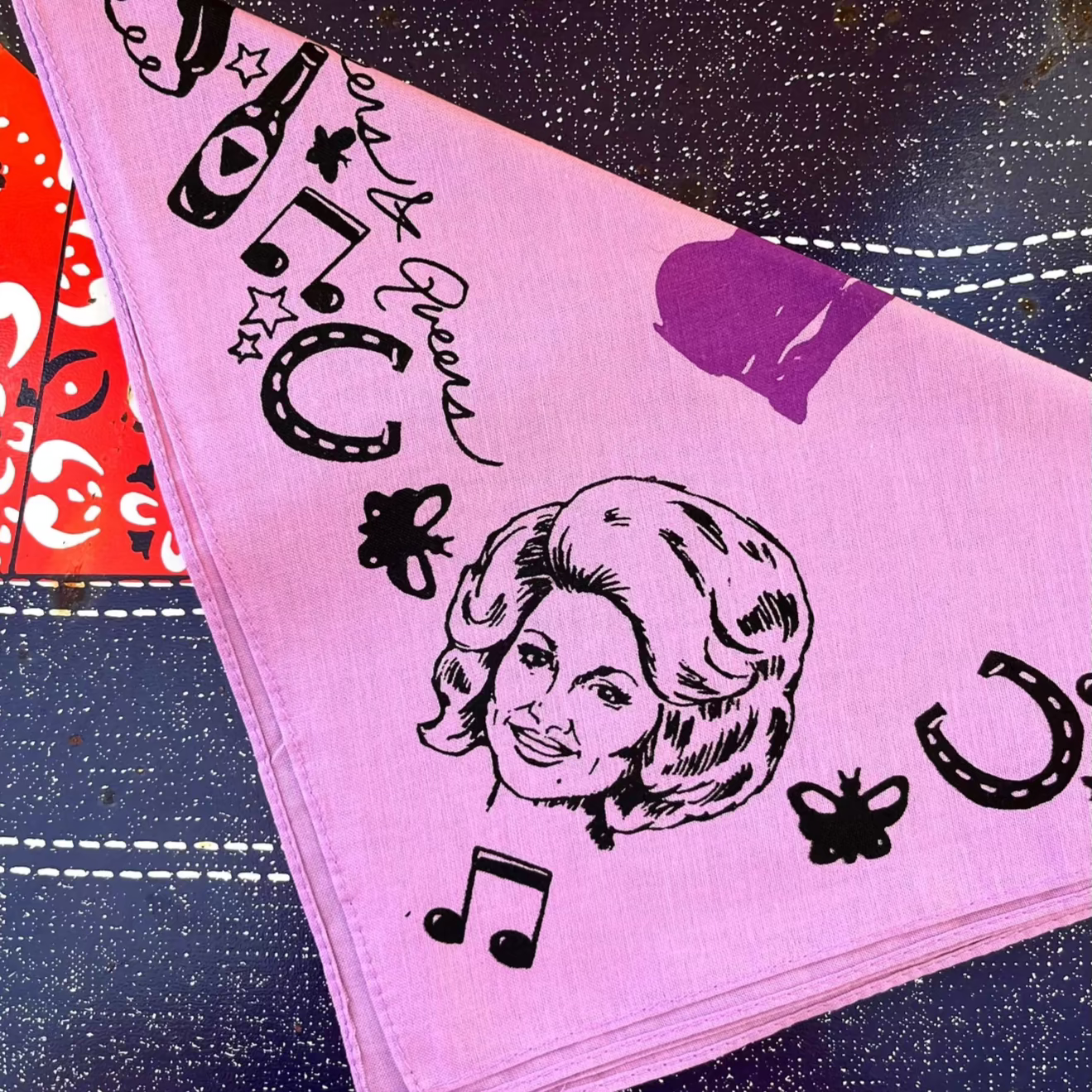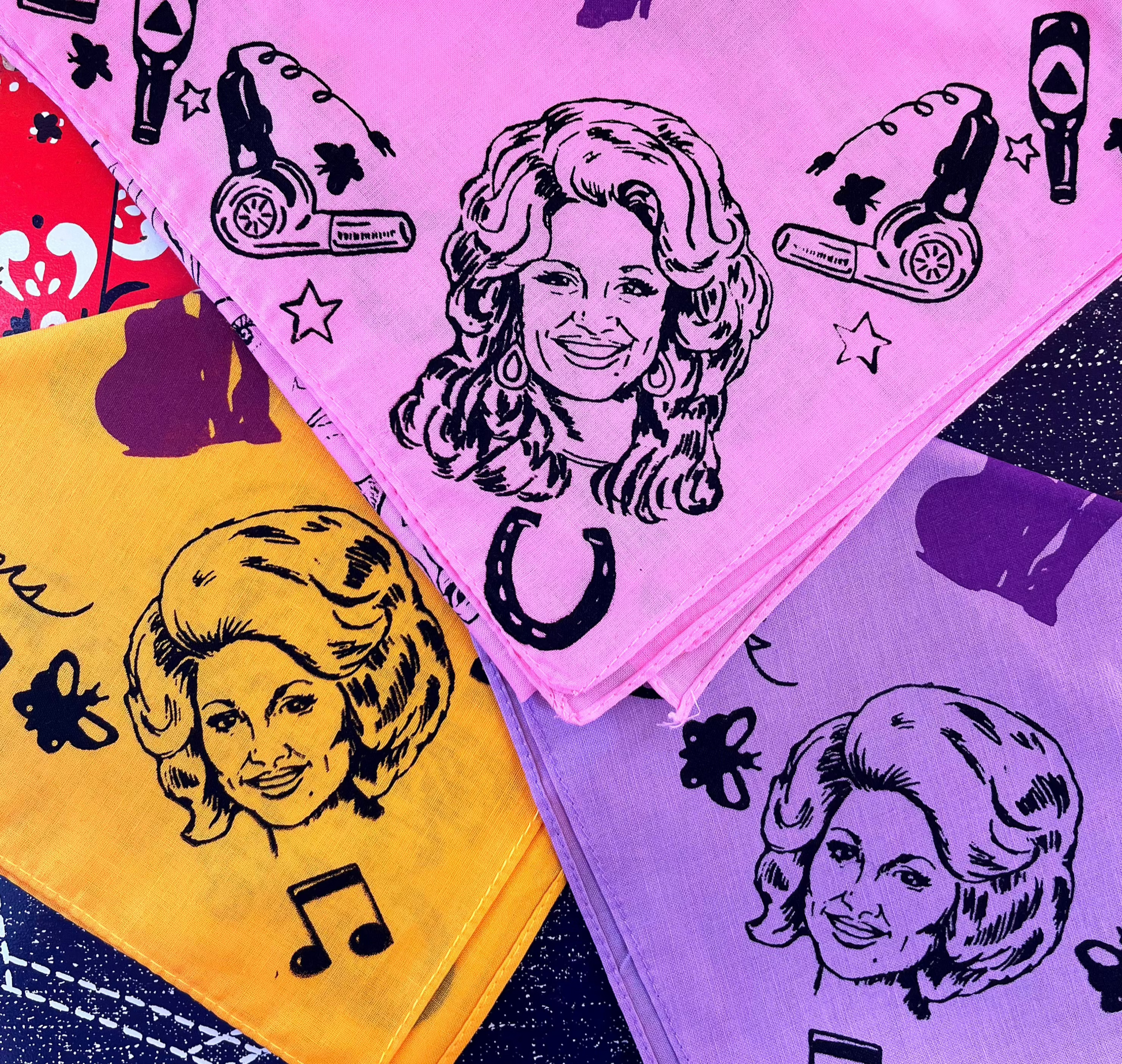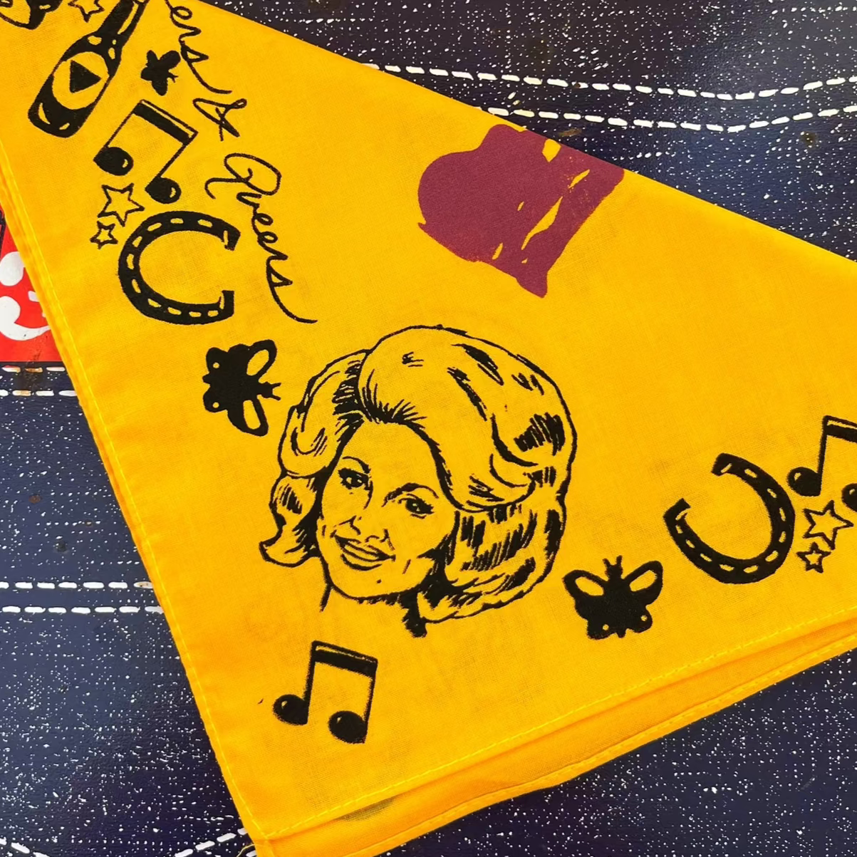 Wear all of the eras of the Queen of Country on this screen printed bandana! Available in pink, purple and yellow.