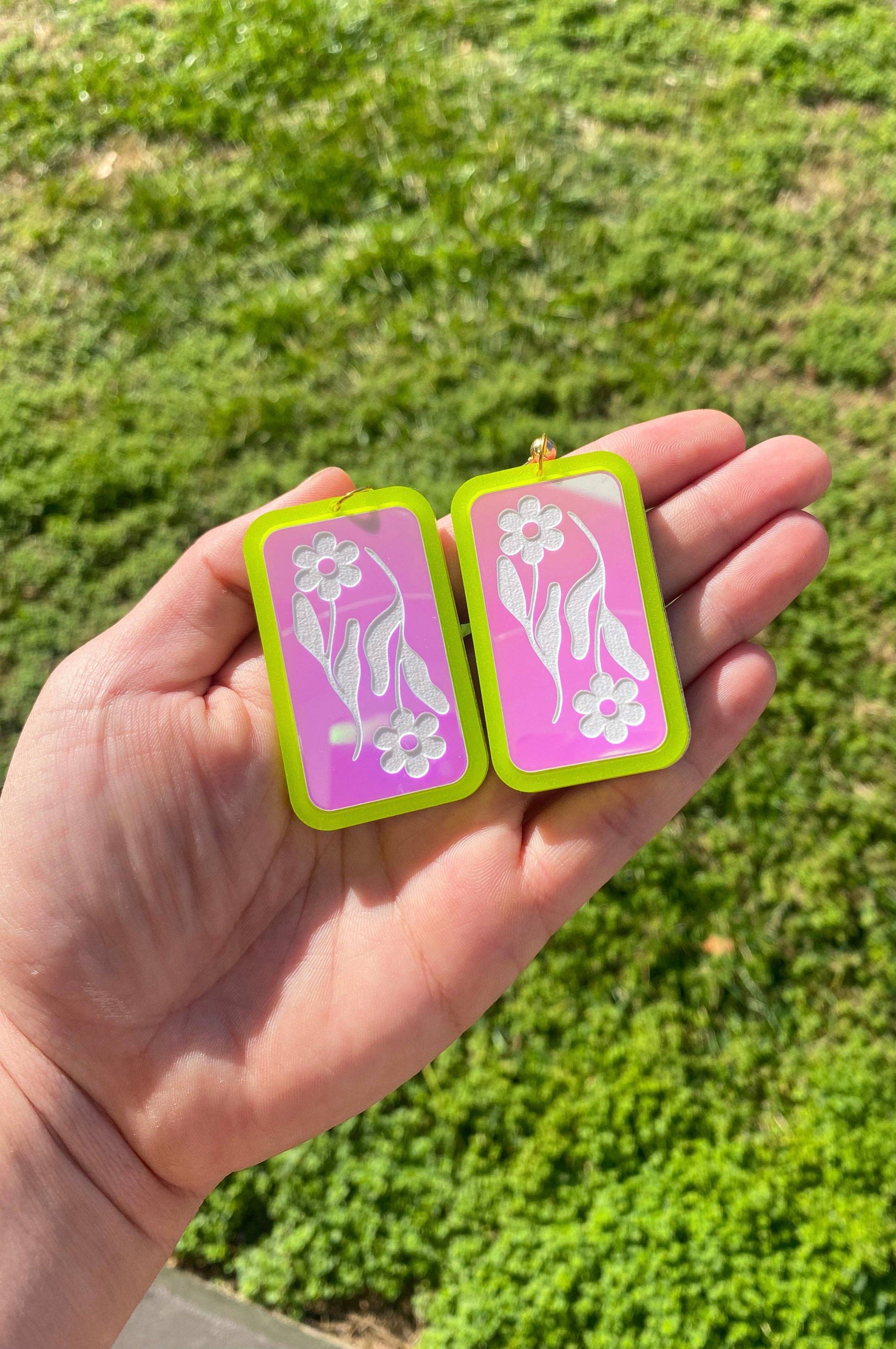 Made with acrylic, acrylic paint and accompanied by gold plated ball studs. Each earring measures 2.8" long.