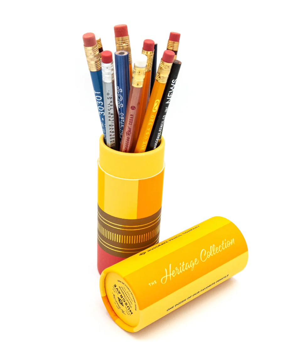 These Variety Packs come with 12 pencils from our Heritage Collection. The set currently includes the 600 News, 1816 Bugle, 510 Hermitage, the 320 Harvest Professional, 100 Test Scoring, 909 Ceres, 500 TOT, 8500 Choo-Choo, 2020 My-Pal, 3030T Cub, 1200 Unigraph F, and the Tennessee Red. Plus, it comes in a heavy-duty paper tube that splits open into two pencil cups designed to sit on your desk. Charming and practical, it’s a set perfect for gifting. Heads up: Two of our pencils come in two colors, so expect to see either a blue or red TOT and a green or blue Cub in your variety pack.