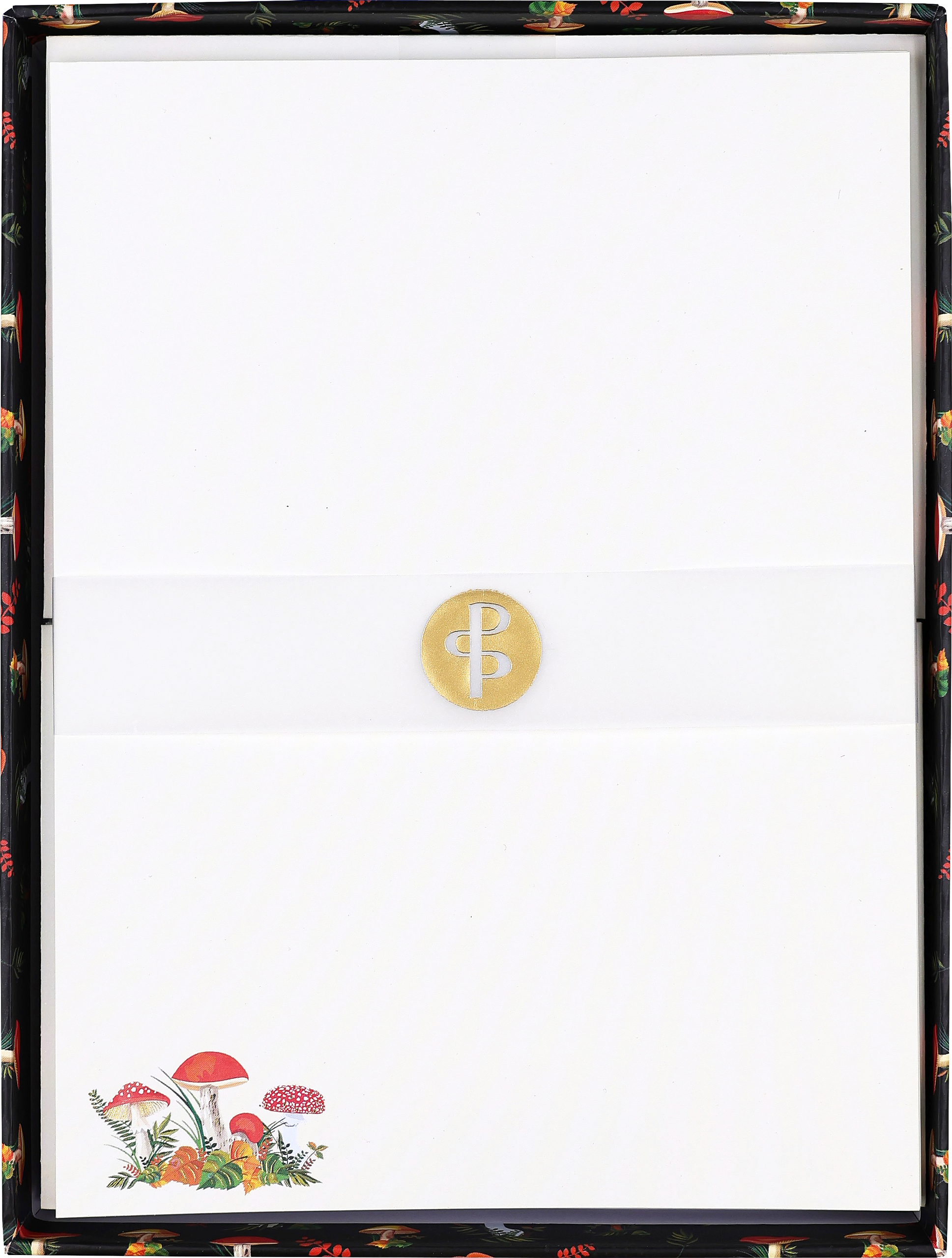 A premium boxed stationery set with 30 letter sheets and 24 envelopes. Each letter sheet features a woodland design in the lower left corner with mushrooms, leaves and ferns. Each sheet measures 5.75x7.75".