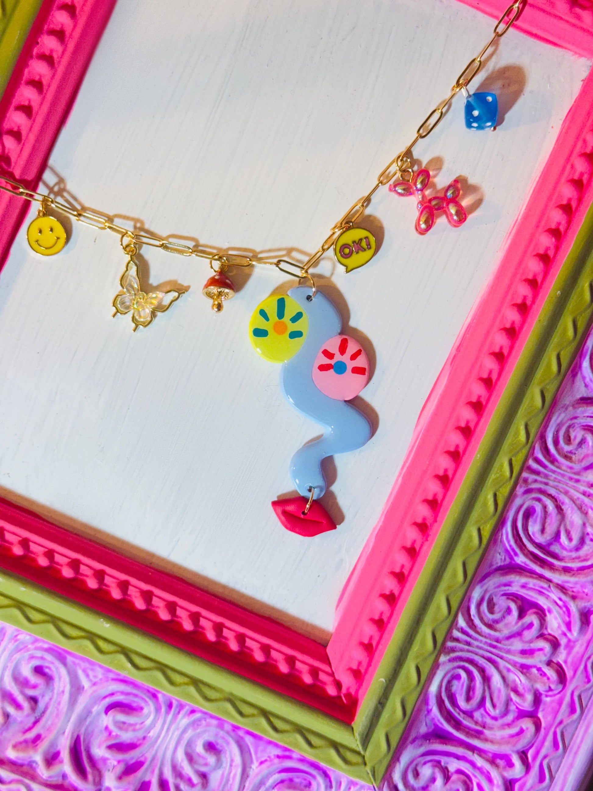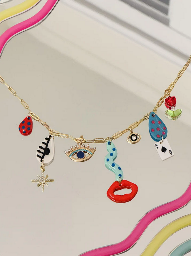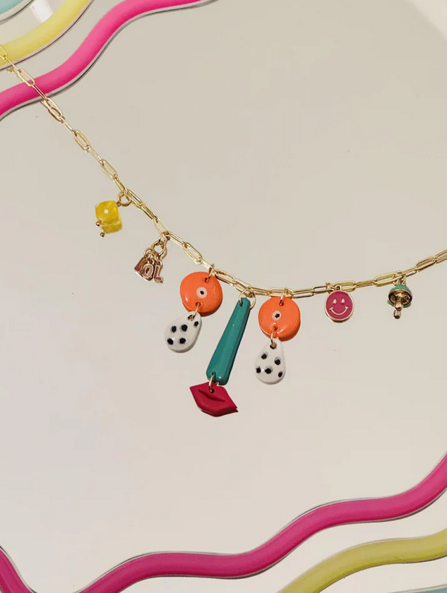 Which face will you get? Every necklace is designed to vary in color and charms, making each accessory a fun surprise! The hand painted charms are crafted from durable and lightweight polymer clay and should be handled with care (do not bend or scratch). The chain is 18k filled gold, made with hypoallergenic metals and measures 20" in length. Please store each necklace in a cool, dry place when not in use.