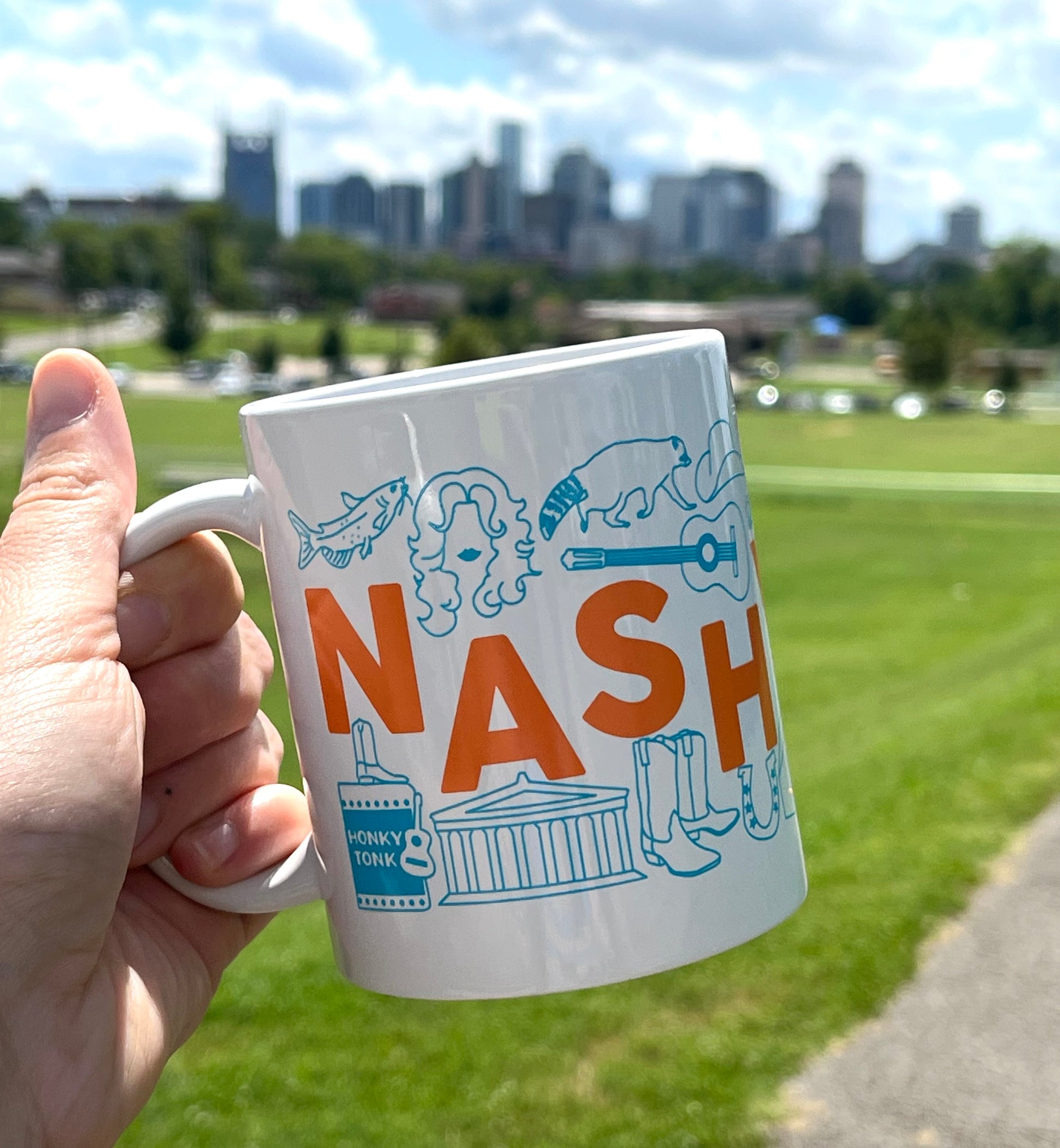 An 11oz ceramic mug featuring our favorite Nashville landmarks and icons, including The Parthenon, Ryman Auditorium, Dragon Park, the "Batman Building", catfish, and more. Measures approx. 3.5x4". Microwave & dishwasher safe.