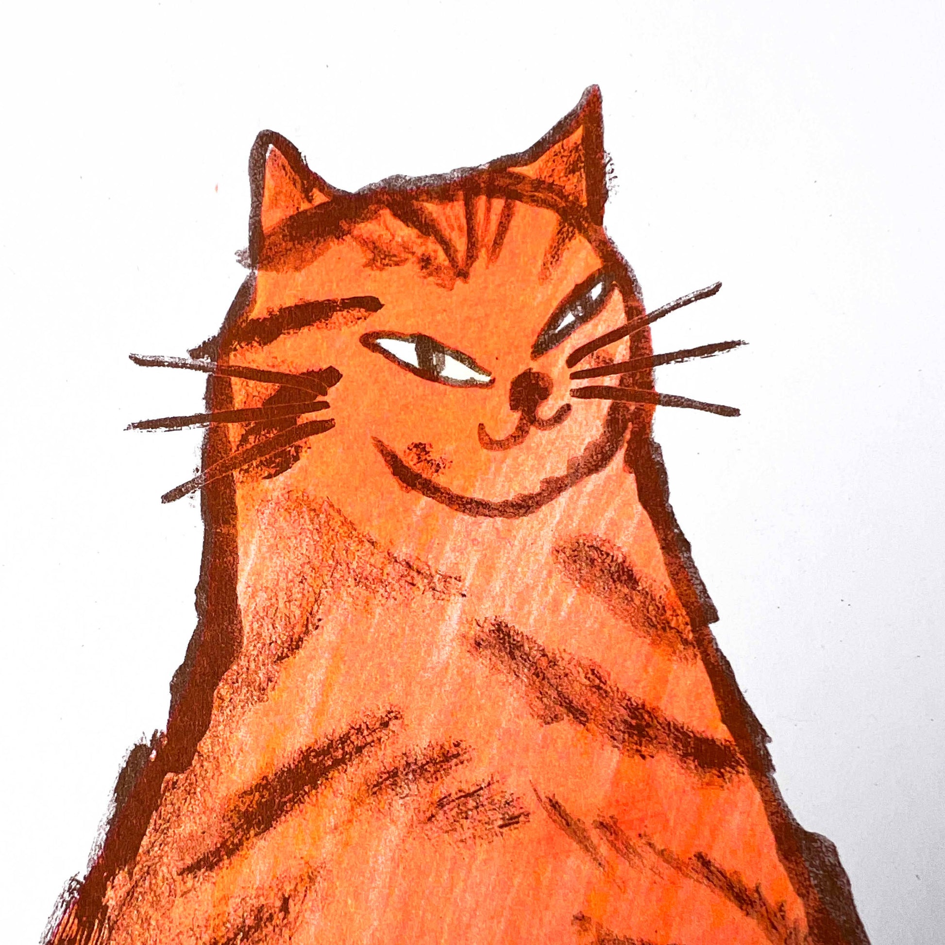 A striking orange cat illustrated by Rachel Cannings and risograph printed on thick recycled paper using eco-friendly plant-based inks. Please note that risograph prints may have subtle differences due to the handmade process. Measures approx. 11.7x16.5".