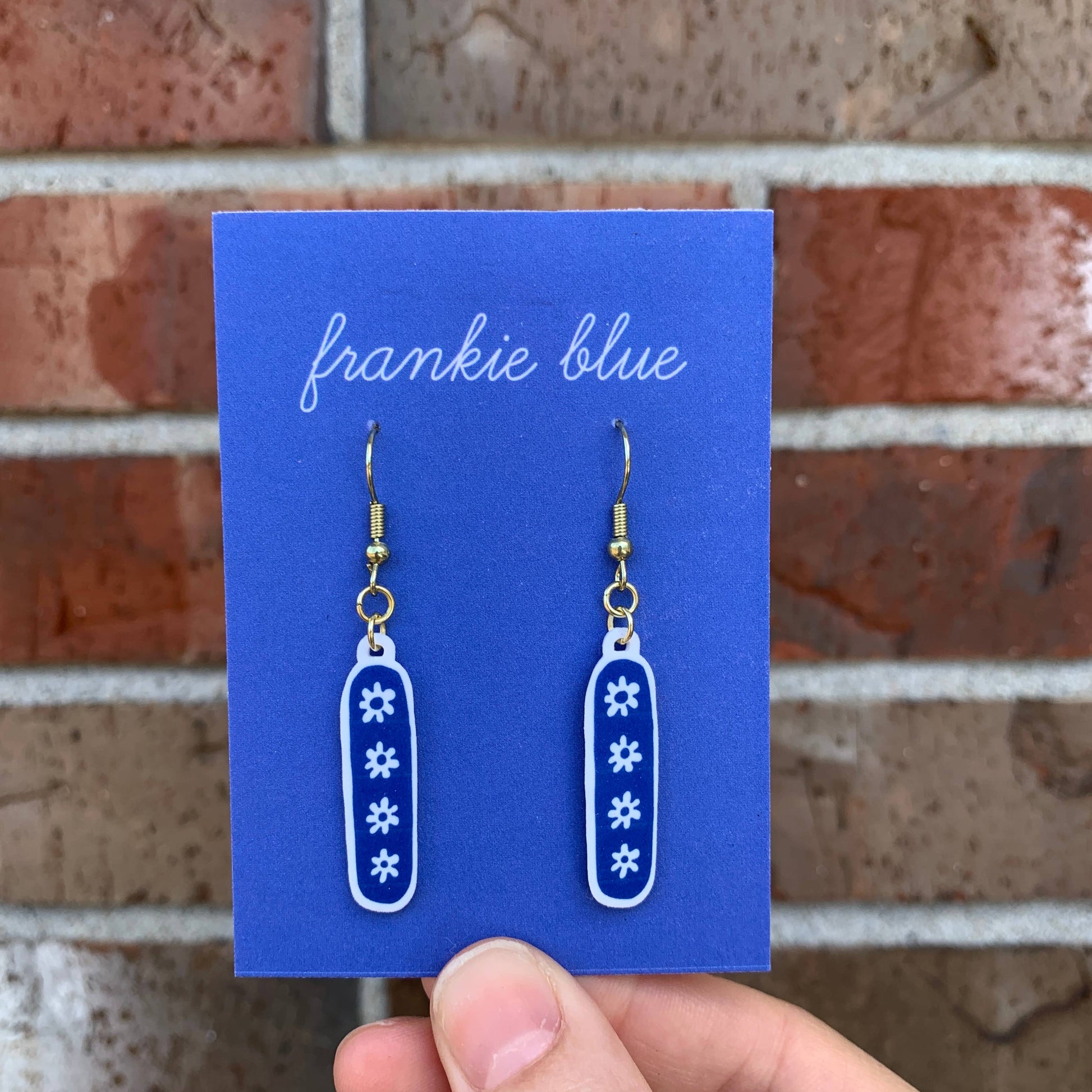 This floral pair of earrings are made from acrylic charm with a hypo-allergenic backing and stainless steel hooks. Design is printed on one side only. Each earring measures approx. 1".