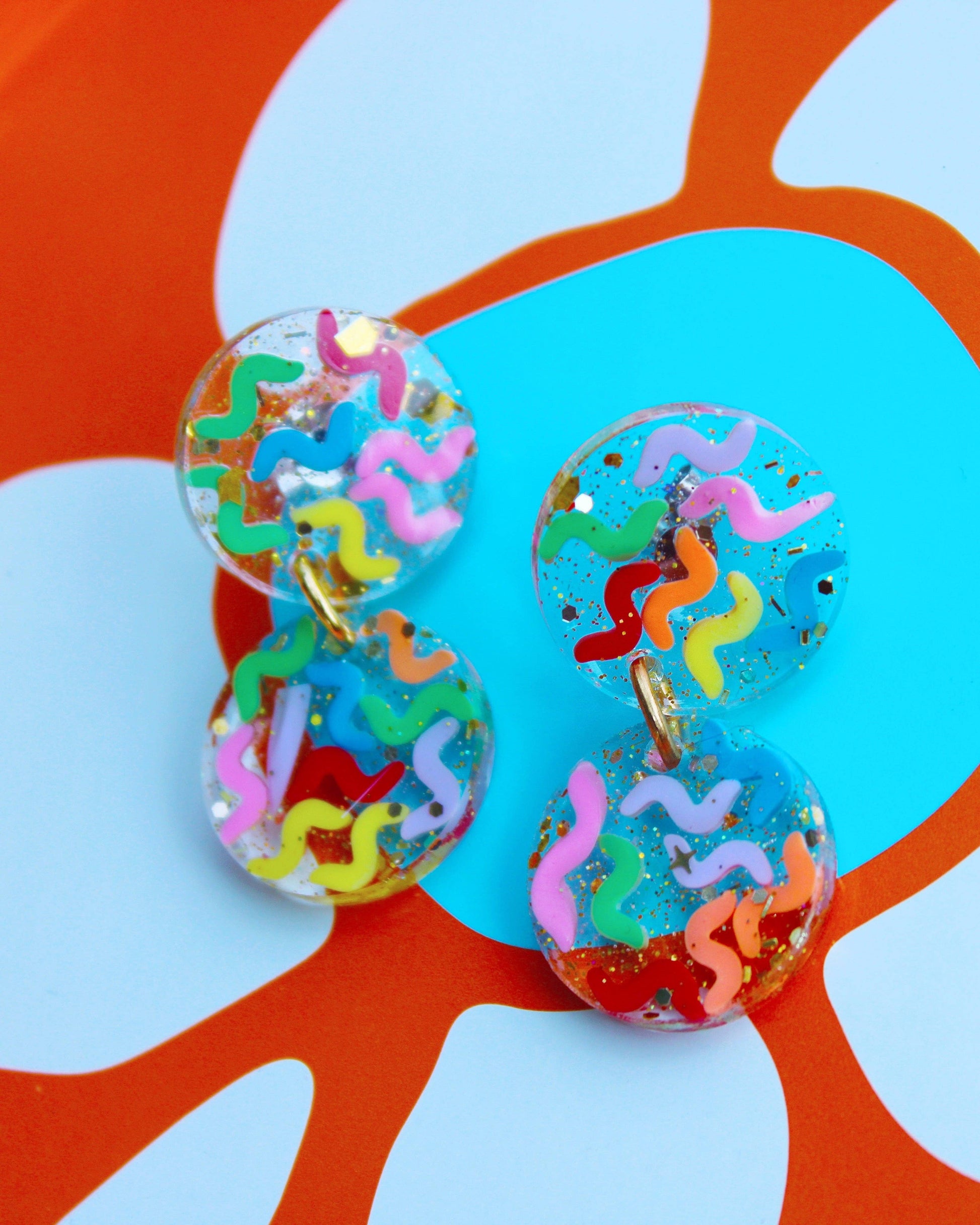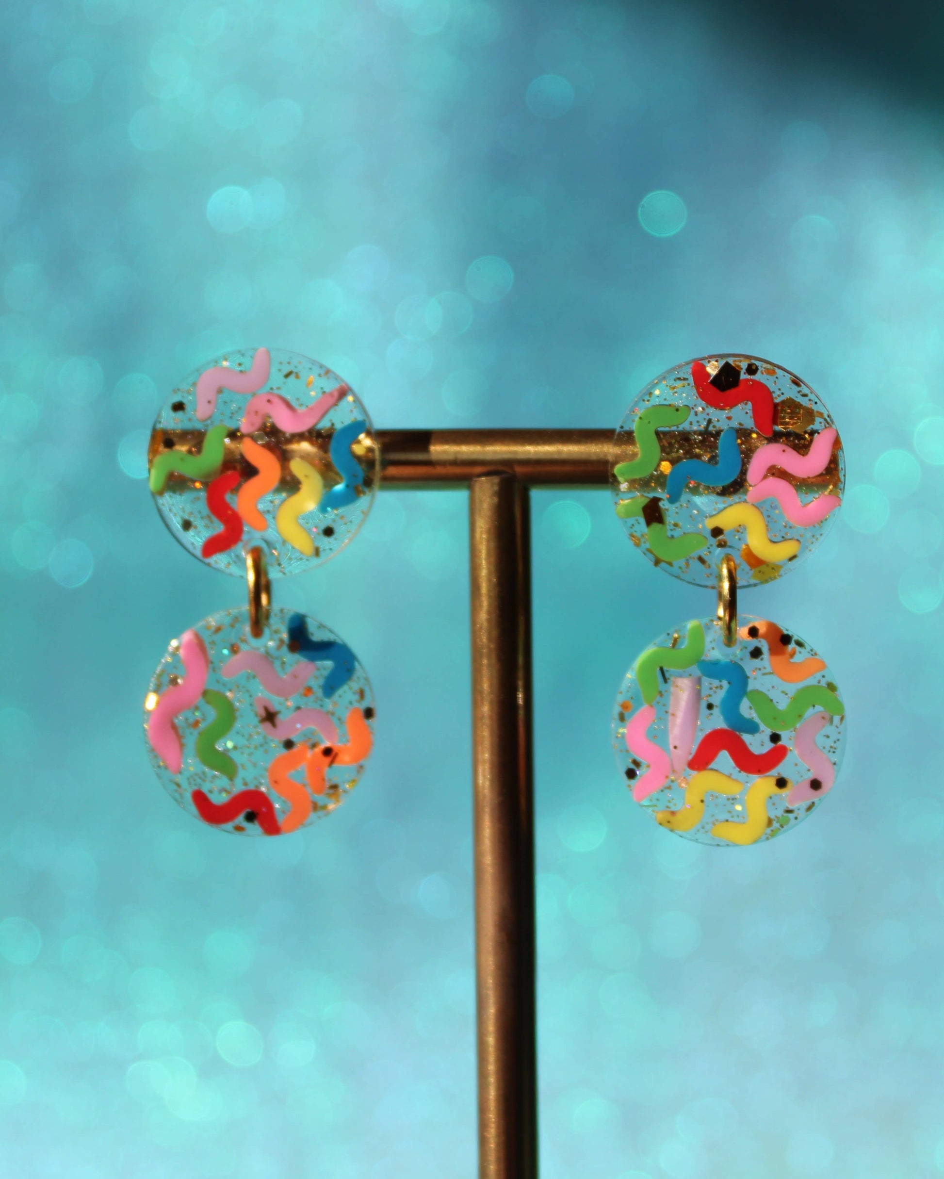 These earrings feature colorful streamers suspended in resin, with a touch of gold glitter for extra shimmer. They measure 2" long and 0.5" at the widest point, and have surgical steel posts. Due to the handmade nature, each pair will vary slightly.
