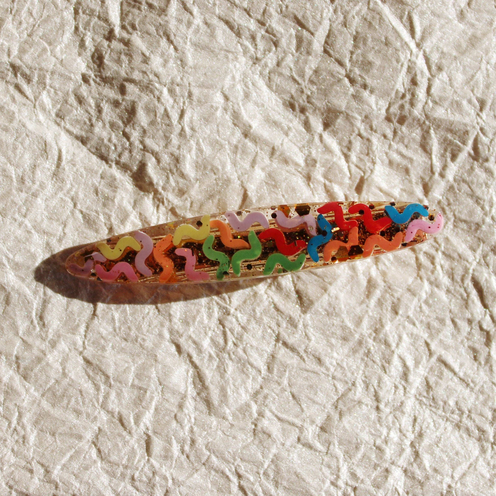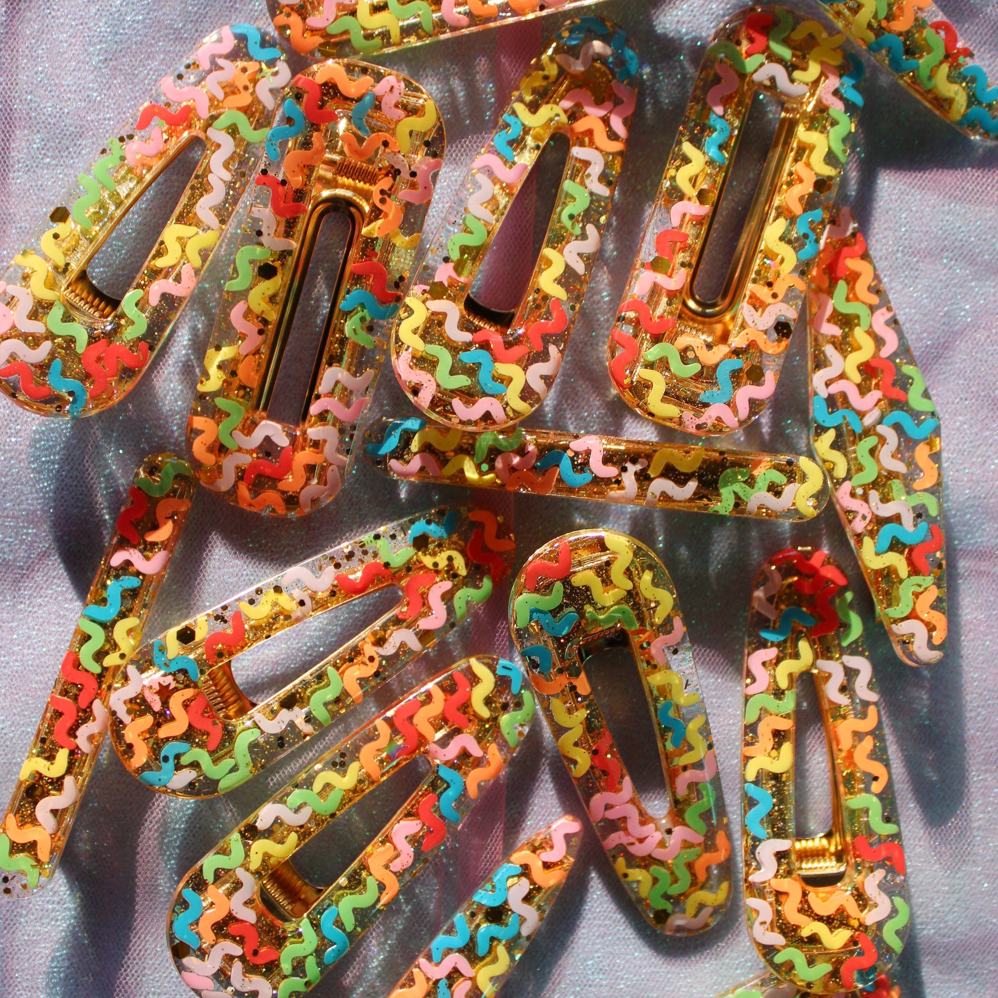 Is there anything more celebratory and enchanting than confetti raining from above? Throw some confetti flair up top with this colorful clip. Due to the handmade nature of the items, please expect slight variations in color and placement of glitter + streamers in the resin pieces. Measures approx. 2.75" long and 0.5" wide.