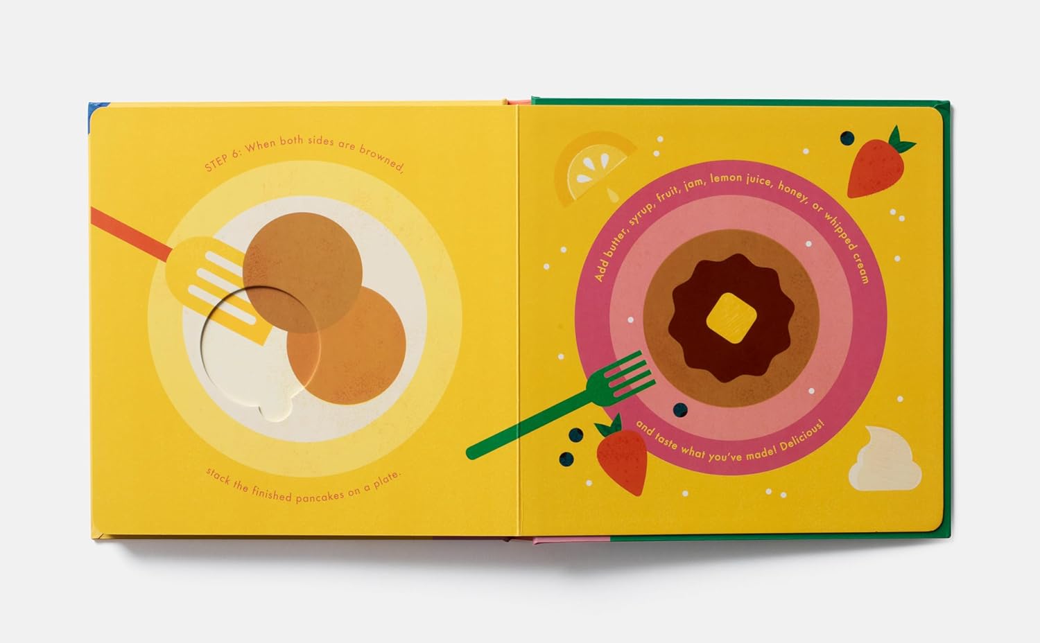 Cook pancakes from scratch inside this recipe book – readers whisk the eggs, flip the pancakes, and more! Simple, straightforward recipe text brings children through each step of cooking while the interactive features, such as pull-tabs, wheels, and a punch-out piece, invite them to participate in the process.