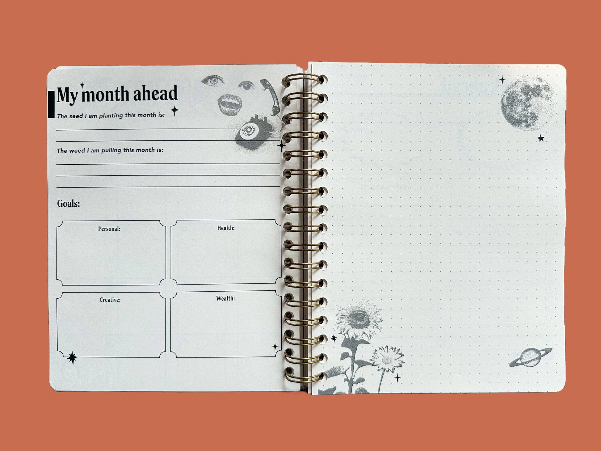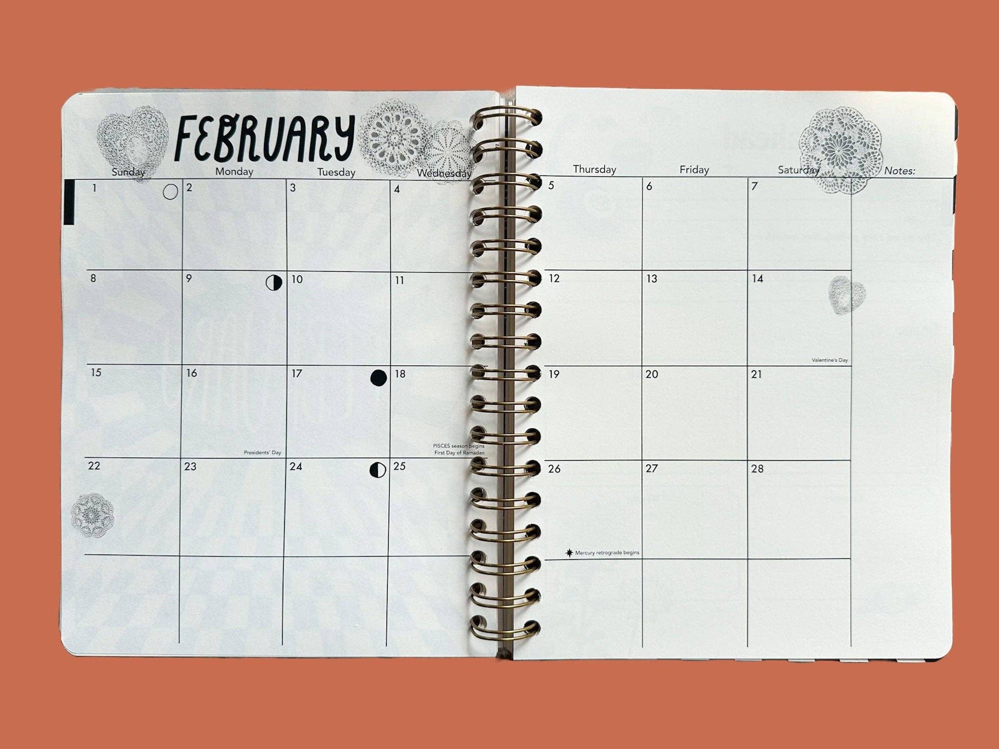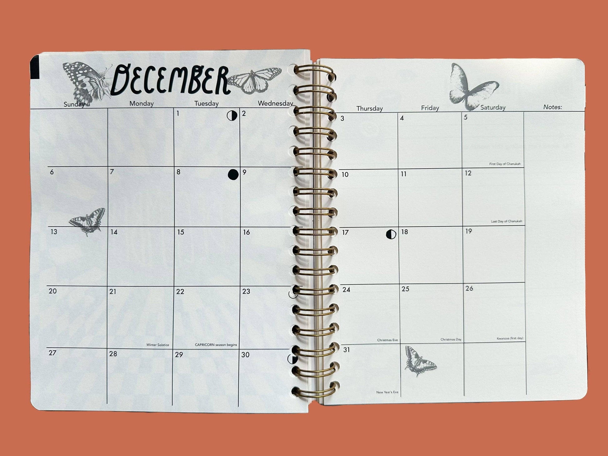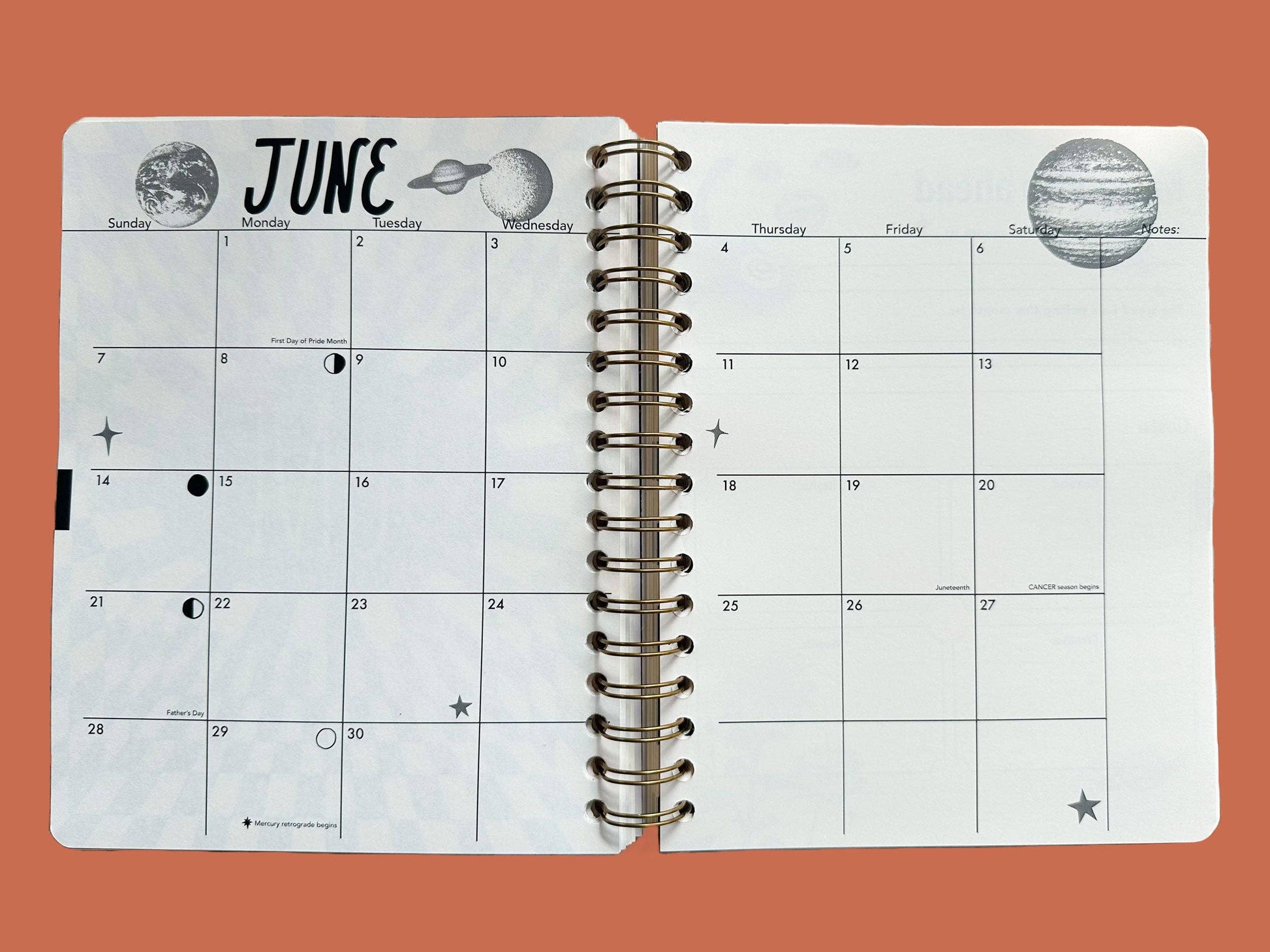 Measures 7"W x 9"L, approx. 1" thick - Comes with optional sticker sheet with month labels to use throughout on your weekly view pages so you can easily find the month you need. - *New and improved* Year Ahead chapter with sections dedicated to personal growth, envisioning your guide for the year, business goal setting and brainstorming, and more. - Includes 12 Monthly views and 5 weekly views per month (you will not use every weekly view page in the year!) - Major dates and lunar calendars for 2026 & 2027, plus mercury