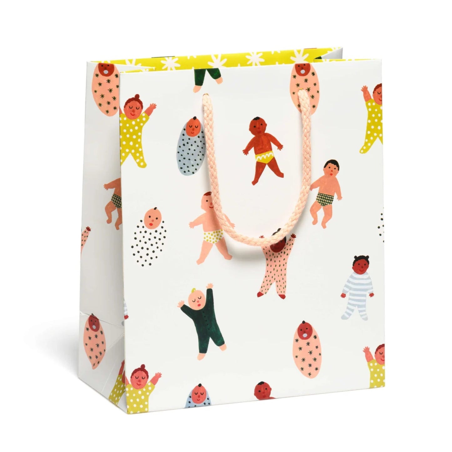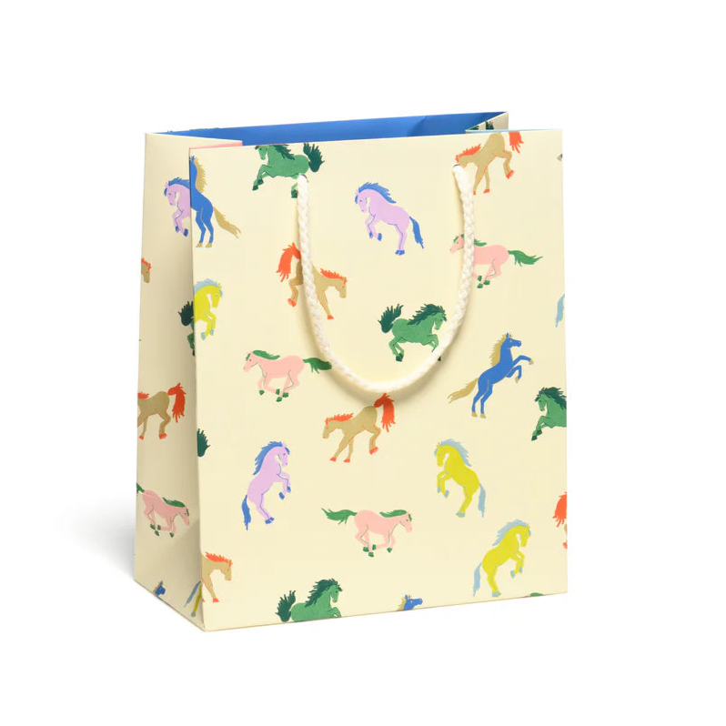 These gift bags are made of heavyweight coated paper with cotton rope handles. Measures approx. 8x4x9.5".