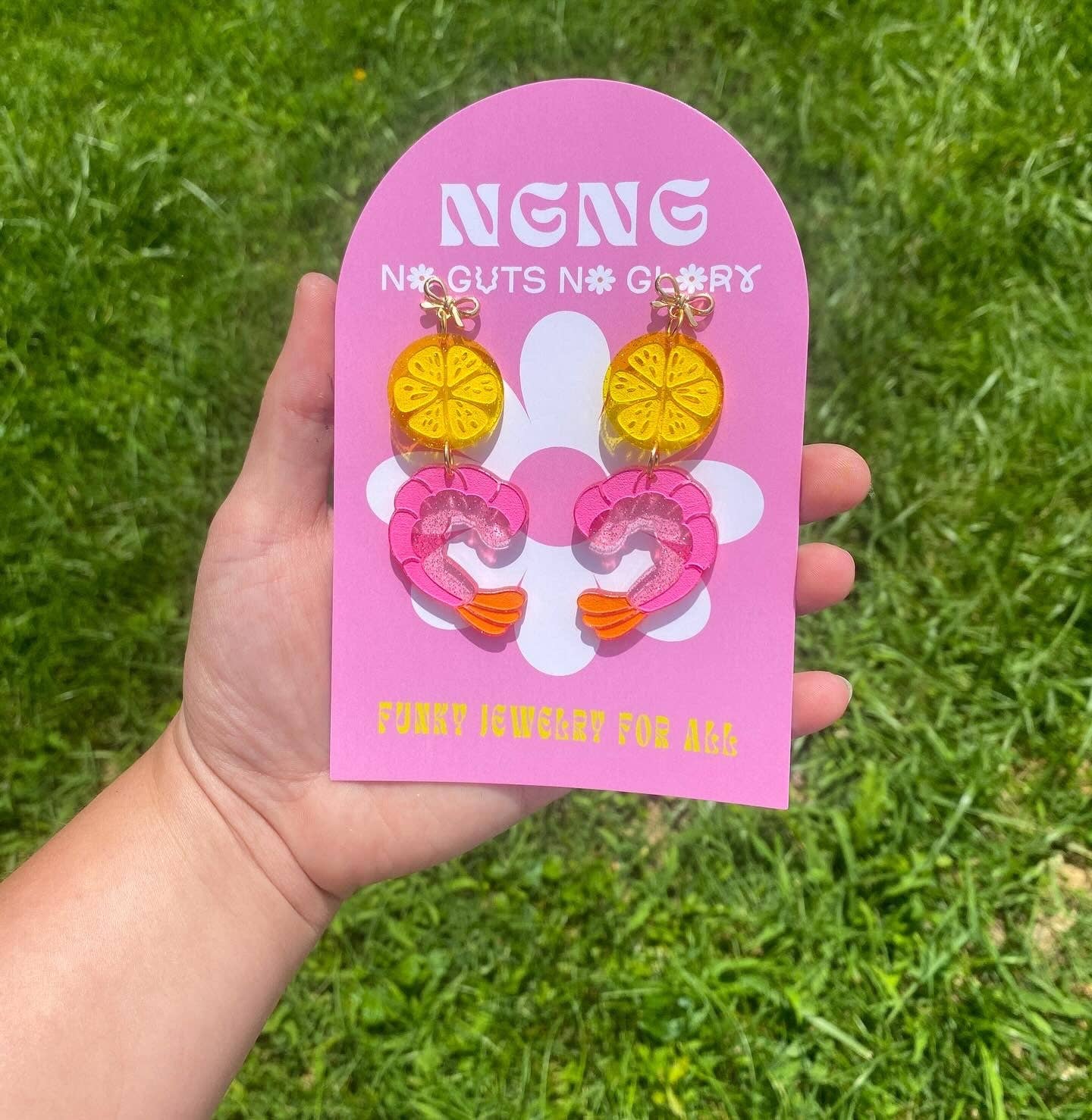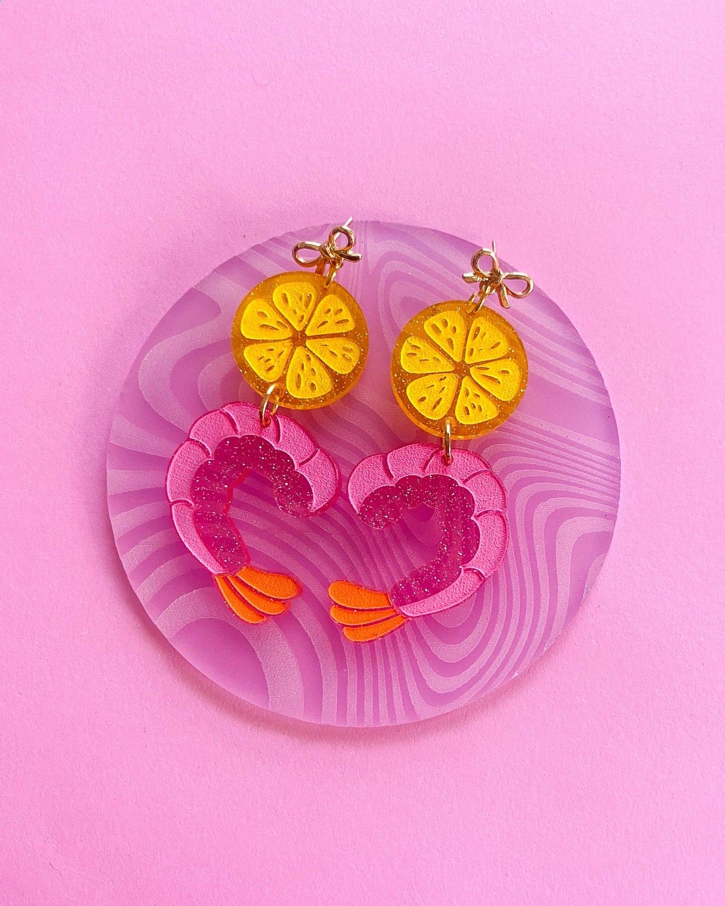 Made with acrylic, acrylic paint and accompanied by nickel-free gold plated bow studs. Each earring measures 2.8" long.