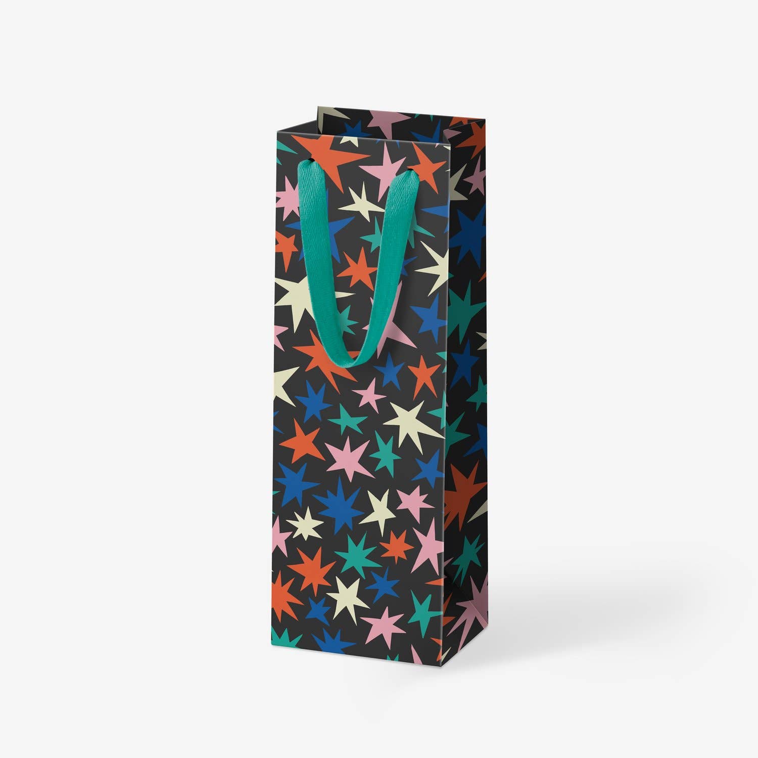 A sturdy, starry wine bag crafted from 100% recyclable paper with ribbon handles. Dimensions: 14.5"H x 5"W x 4" deep.