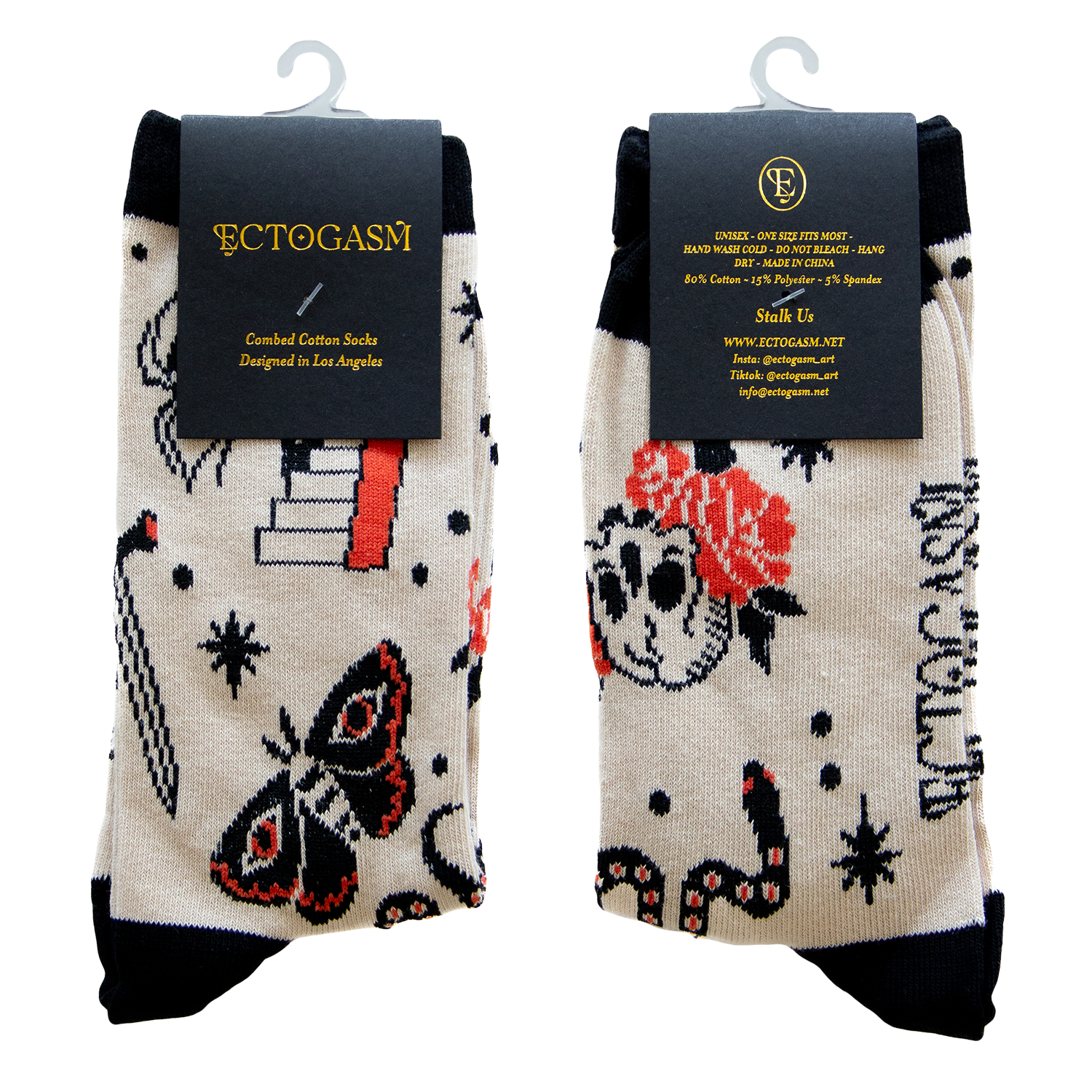 These cool socks are woven with a tattoo flash inspired pattern of spiders, snakes, skulls, roses, and more.