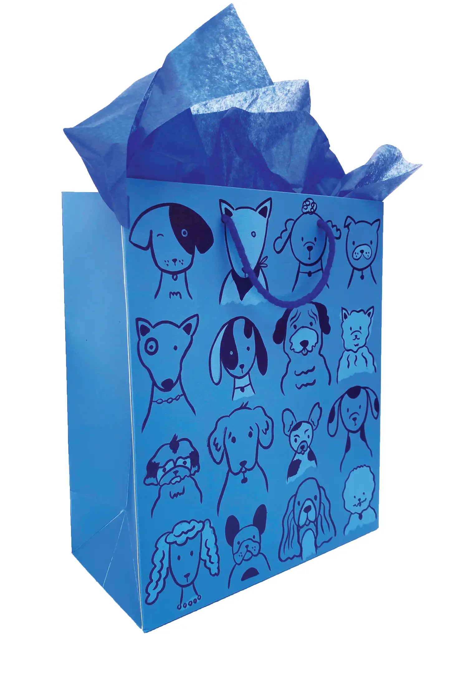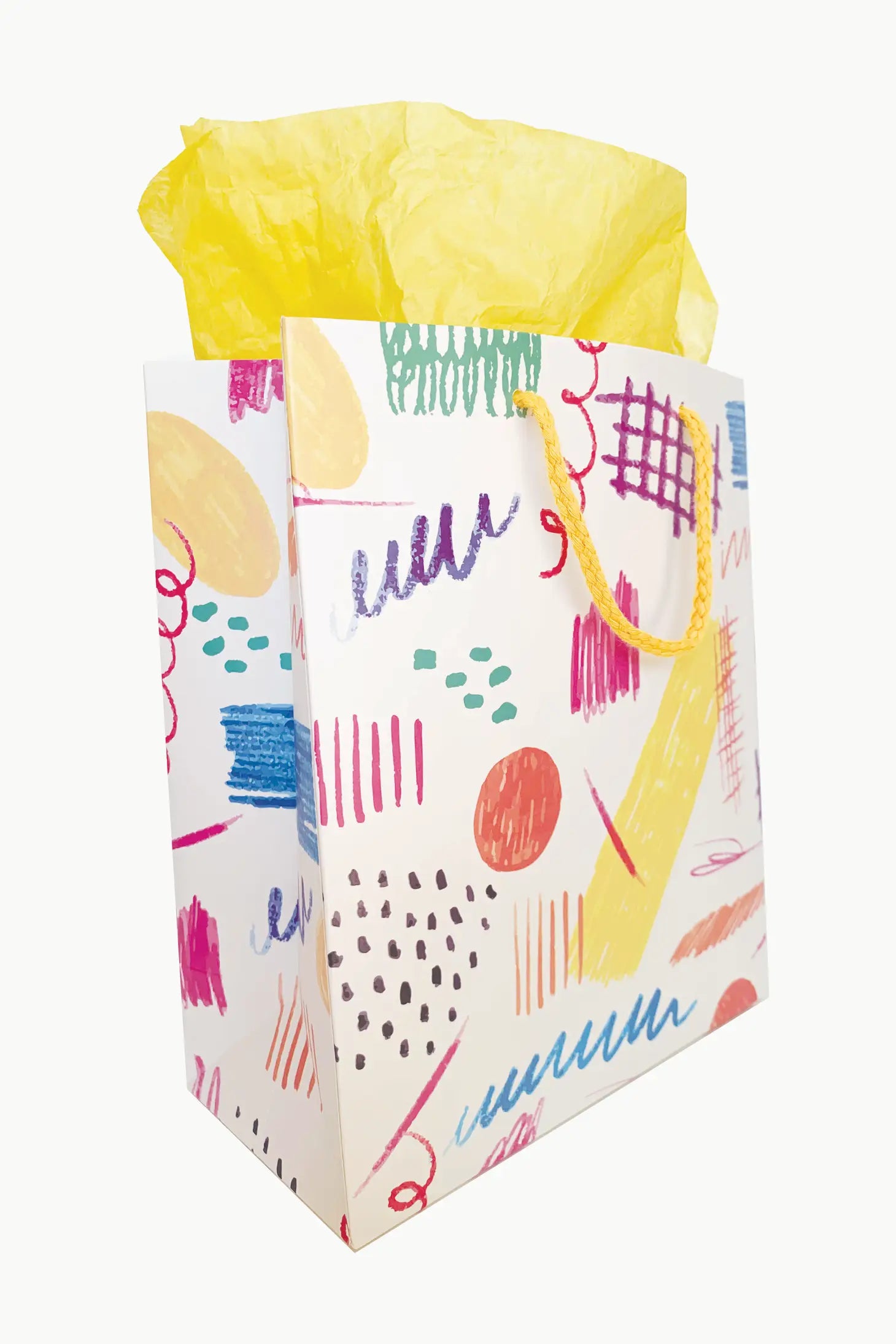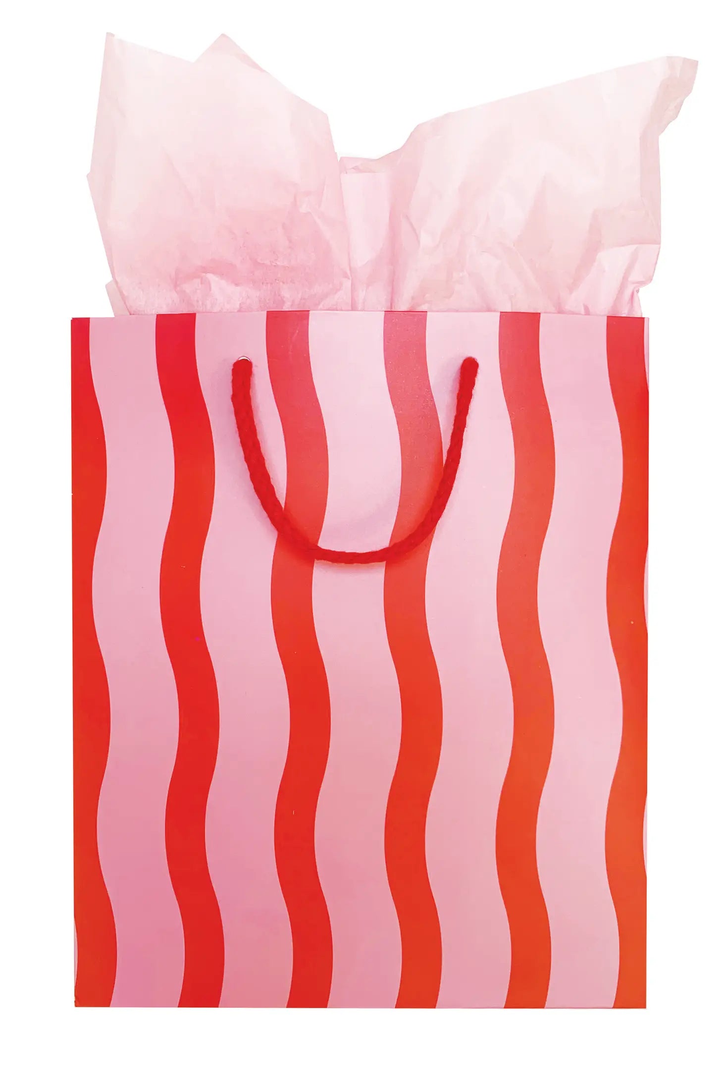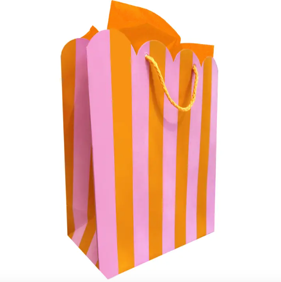 These gift bags by The Social Type are made of heavy coated printed stock and have a woven cord handle. Dimensions: 8x4x9.5".