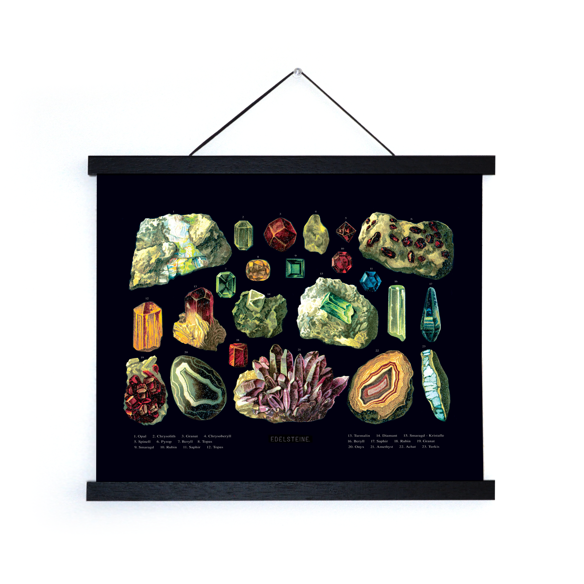 Edelsteine (German for "gemstones") is from “Erdgeschichte (1895)” by Melchior Neumayr. Erdgeschichte translates to Earth History and contains illustrations and diagrams of geological finds from the world. The art is giclée quality on sustainably produced paper made from cotton remnants. Hanging frame not included.