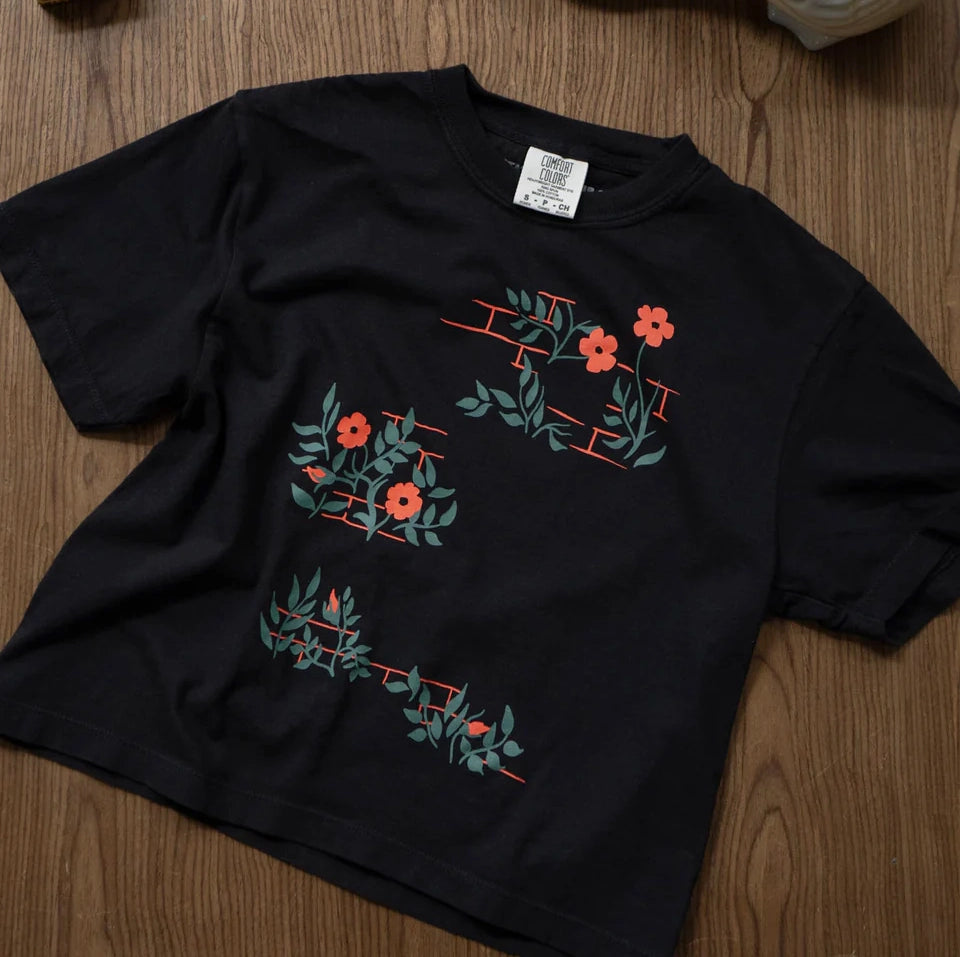 This black boxy tee is perfect for summer with its pretty depiction of vibrant red flowers and deep green vines growing up a brick wall. Made from 100% cotton and printed with eco-friendly water-based ink.