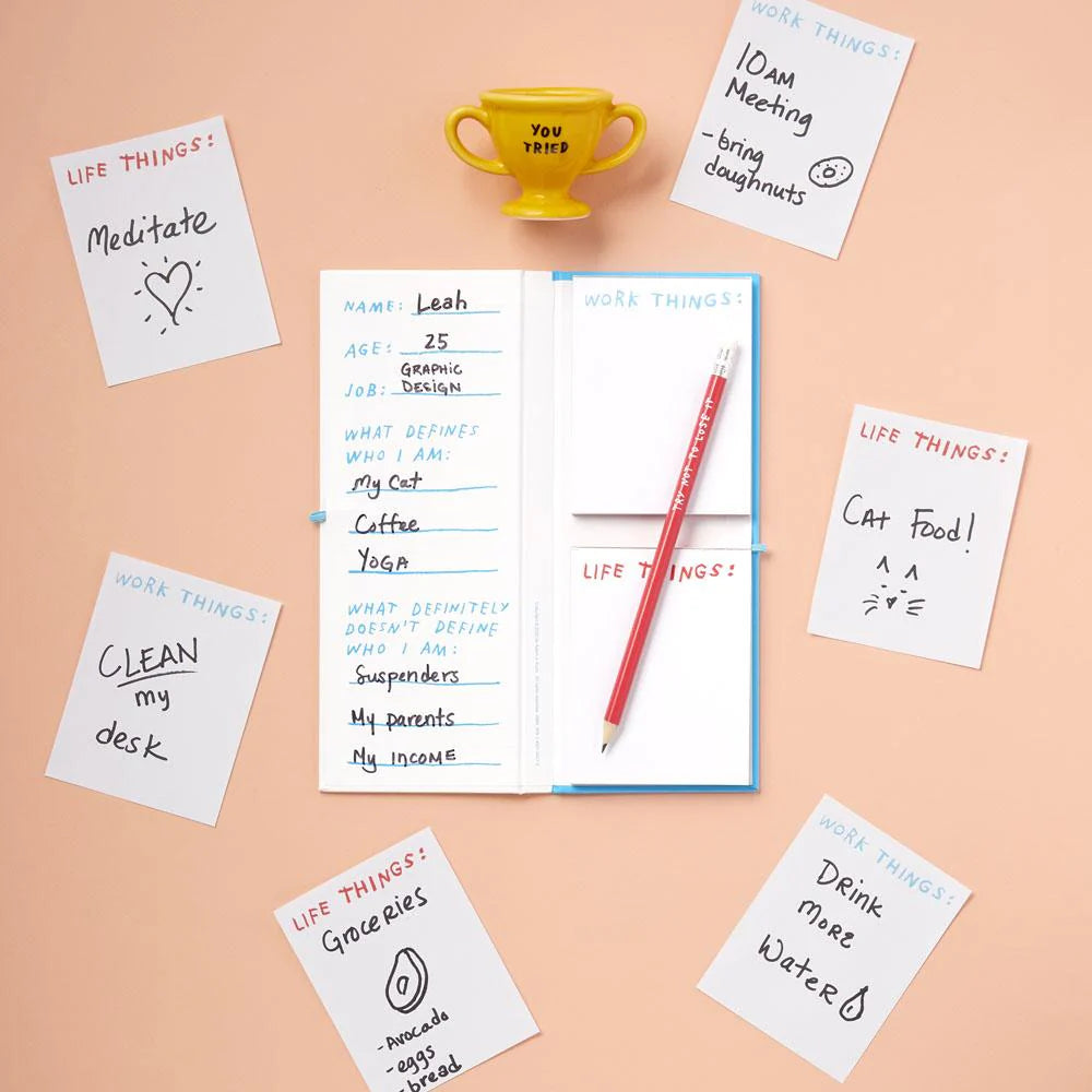 - 2 lined notepads (1 for "Work Things" and 1 for "Life Things" that measure 3 5/8 x 9" each